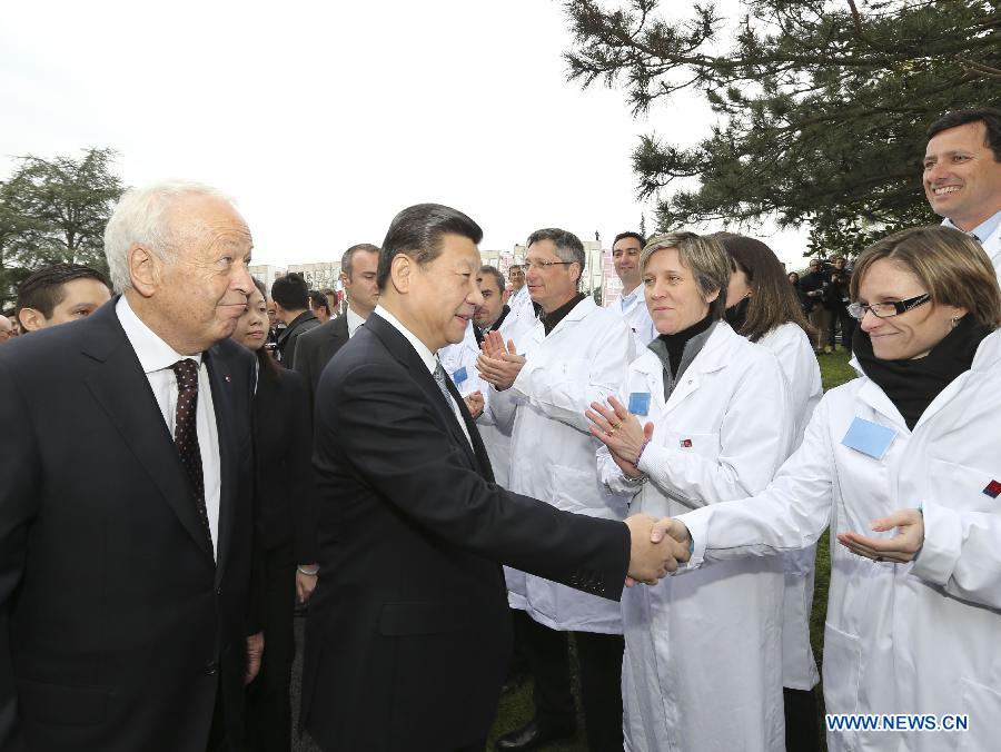 Chinese President Xi Jinping (2nd L, front) shakes hands with researchers while he visited the Biomerieux research center in Lyon, France, March 26, 2014. (Xinhua/Lan Hongguang)