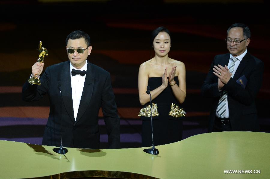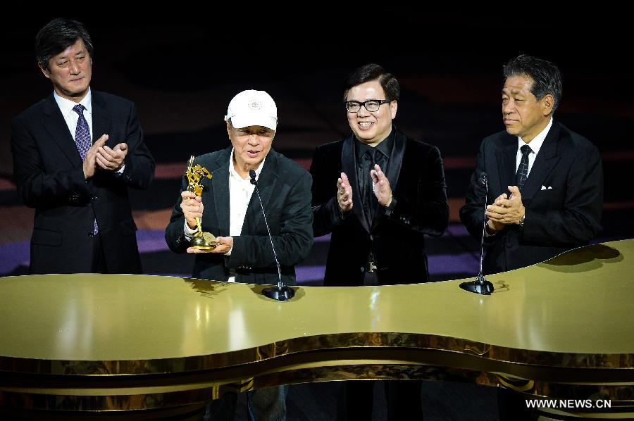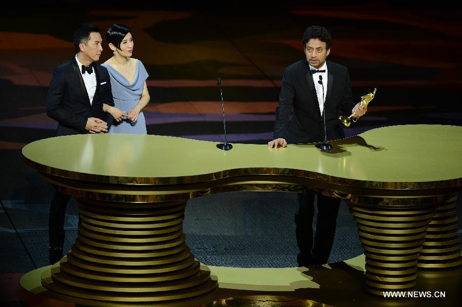 Actress Zhang Ziyi (C) speaks after winning the Best Actress Award for her movie "The Grandmaster" during the Asian Film Awards ceremony in Macao, south China, March 27, 2014. (Xinhua/Cheong Kam Ka)