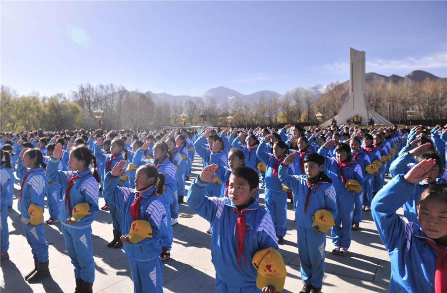 A flag-raising ceremony is held to celebrate the 55th anniversary of serfs' emancipation in Lhasa, capital of southwest China's Tibet Autonomous Region, March 28, 2014. (Xinhua/Liu Kun)