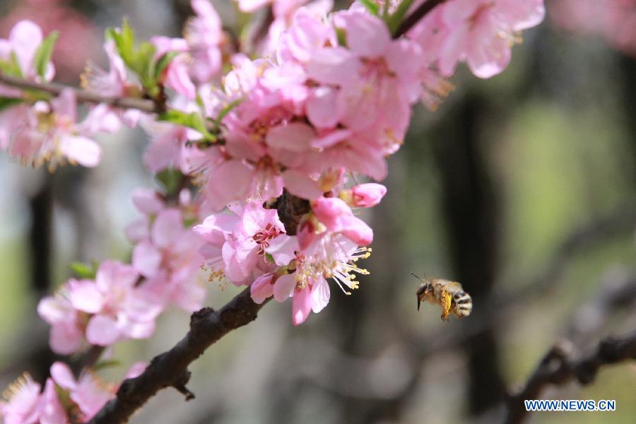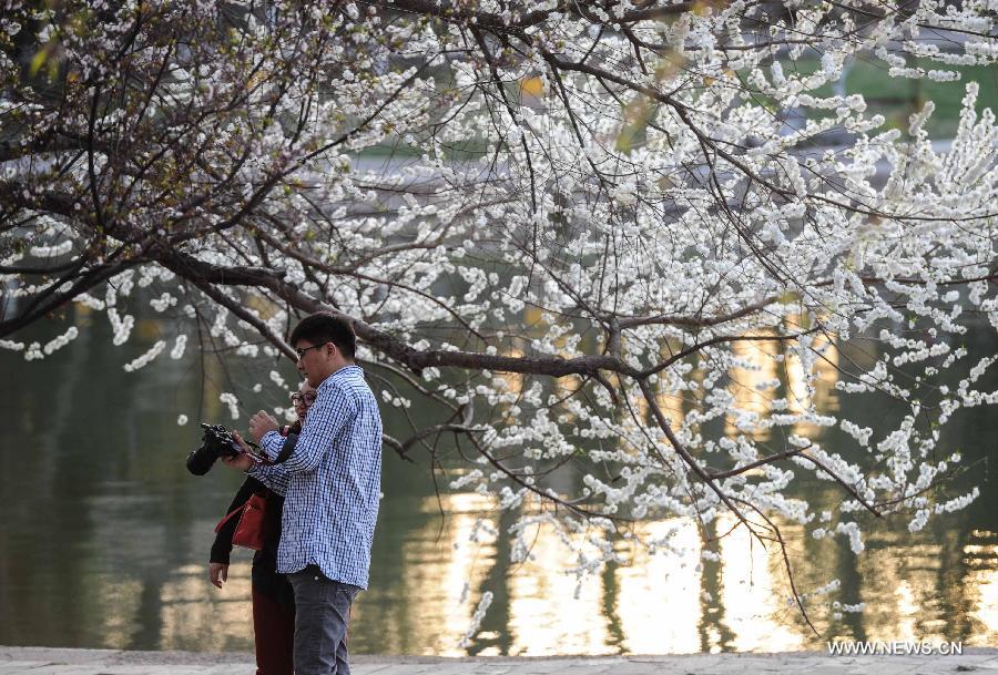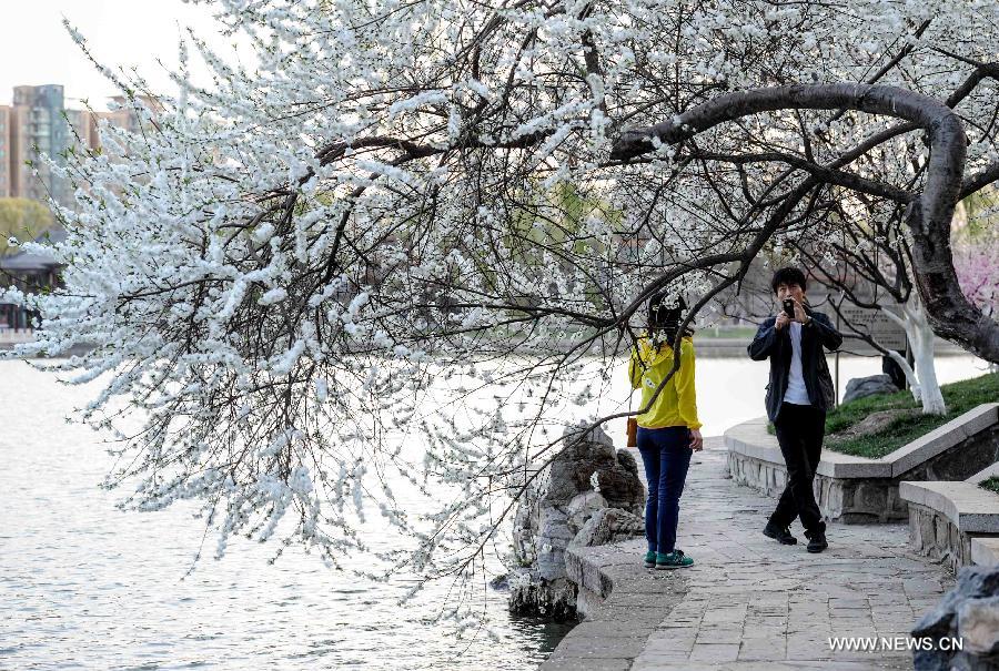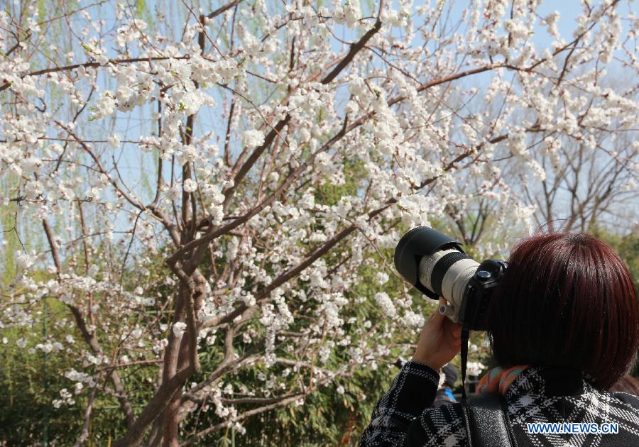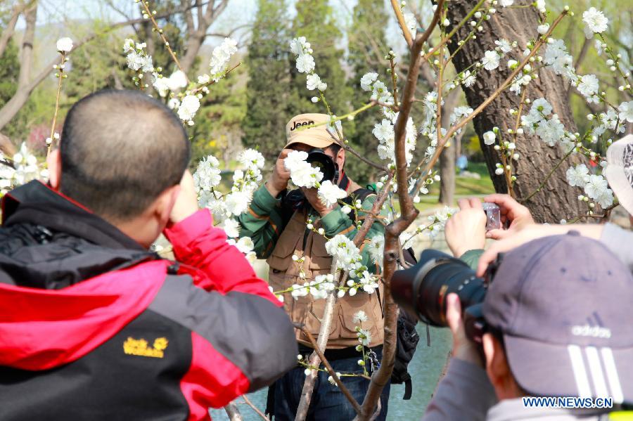 Tourists take photos of blooming flowers at Longtan Park in Beijing, capital of China, March 29, 2014. Because of the recent heat wave, the flower blooming season in Beijing arrived ahead of schedule. It was estimated that the parks in Beijing would receive 1.5 million person-time during the Qingming Festival, which falls on April 5 this year. (Xinhua/Luo Xiaoguang)