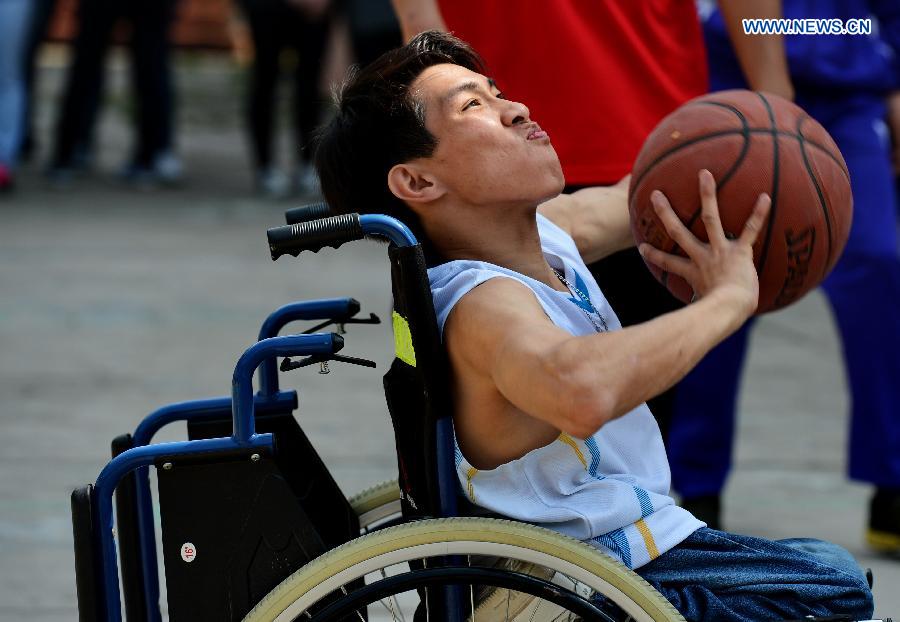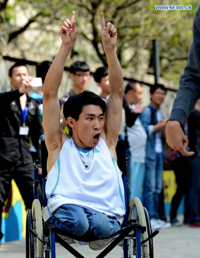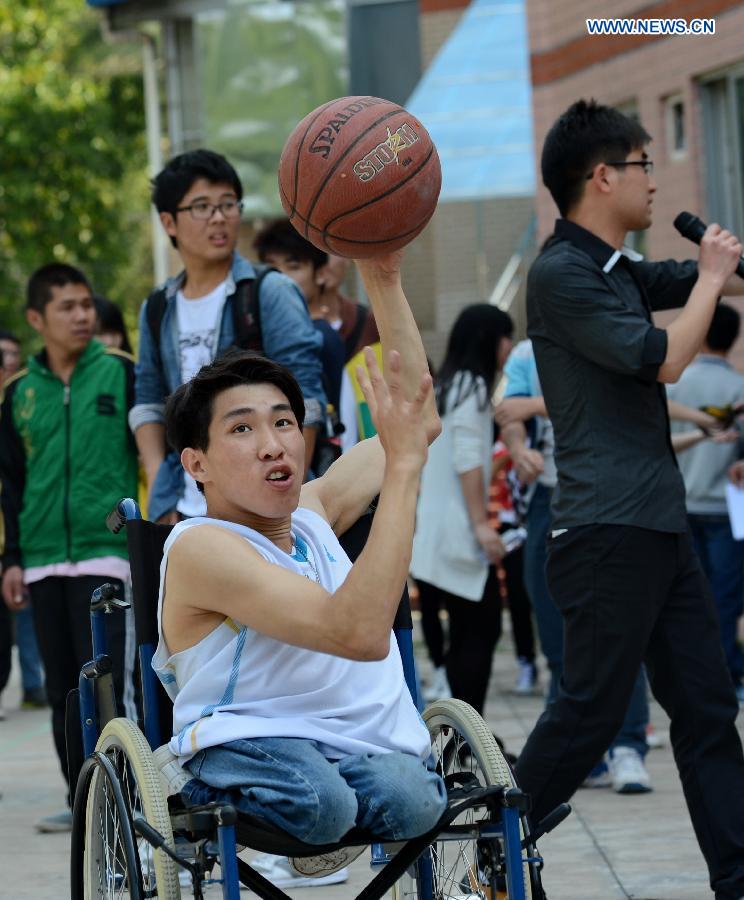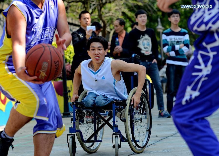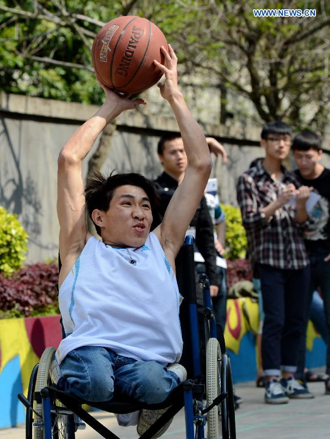 You Tong plays basketball during a friendly game in Fuzhou, southeast China's Fujian Province, March 30, 2014. The cerebral palsy patient You Tong achieved his dream of playing basketball as a member of the provincial wheelchair basketball team under the help of kindhearted people of the society. (Xinhua/Zhang Guojun)
