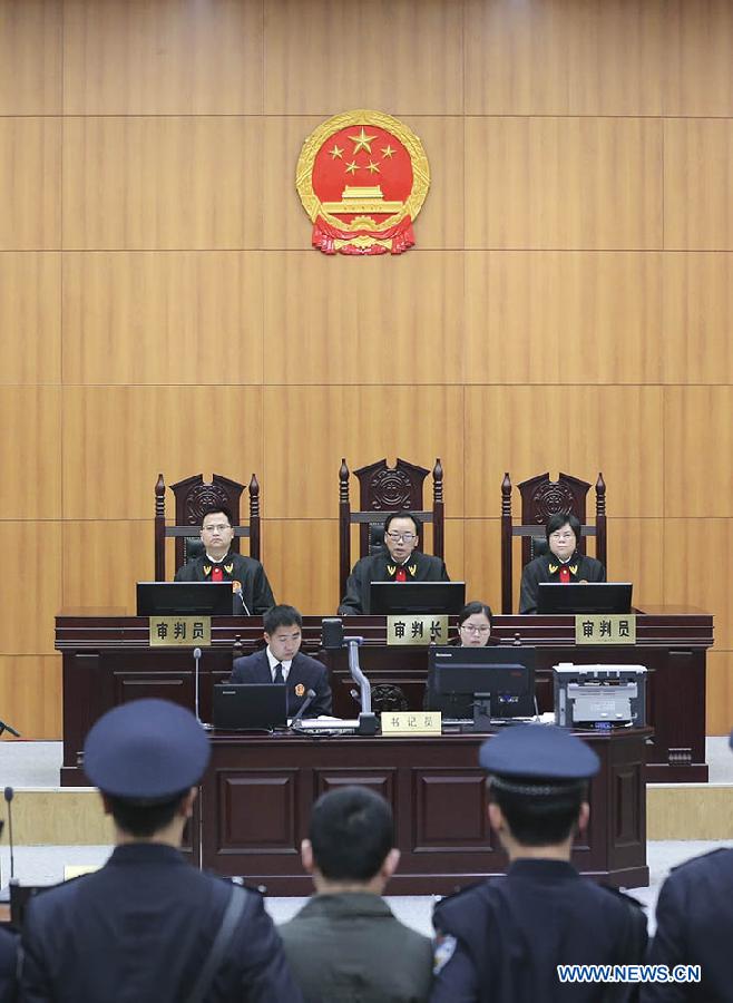 An alleged mafia-style gang stands trial on charges including murder at the Xianning Intermediate People's Court in Xianning City, central China's Hubei Province, March 31, 2014. The 36-member gang, allegedly led by former mining tycoon Liu Han and his brother Liu Wei in southwest China's Sichuan Province, is the largest mafia-style criminal group under trial in recent years in the country. (Xinhua/Ding Lin)