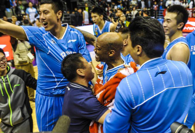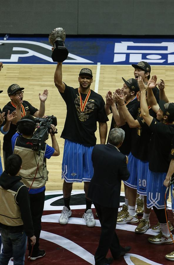 The Beijing Ducks raise the CBA Championship trophy after their victory over the Xinjiang Flying Tigers 98-88 on Sunday in Urumqi. The Ducks won the CBA Finals by 4 games to 2, defending their first-ever title won in 2011-12. [Photo/Xinhua]