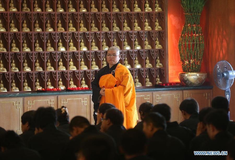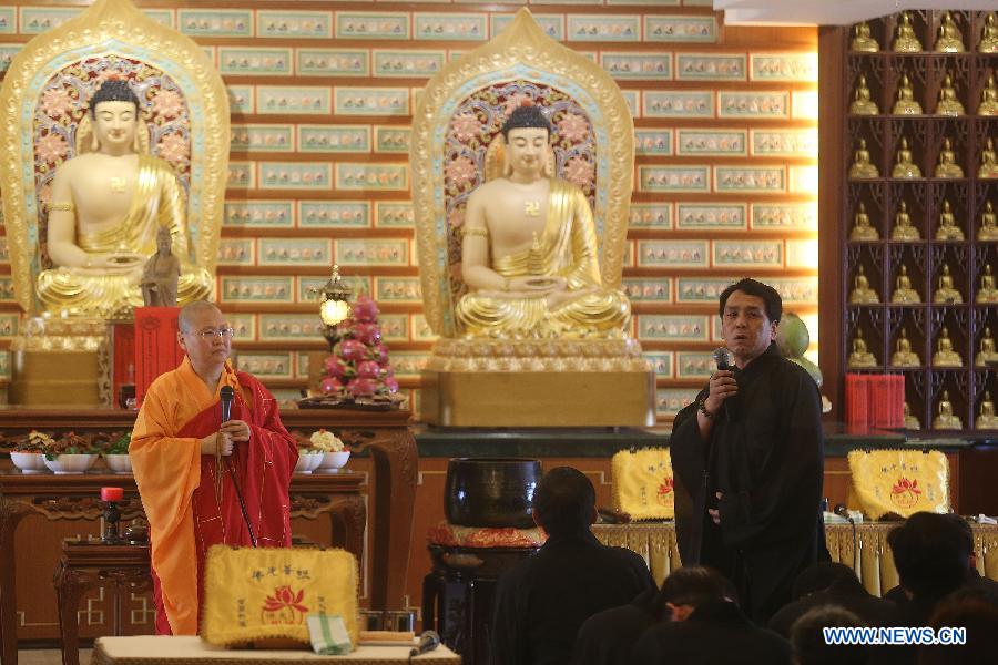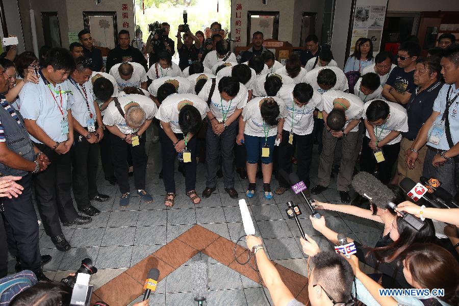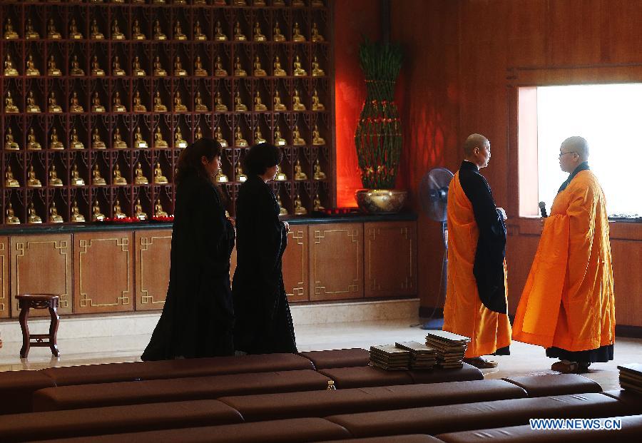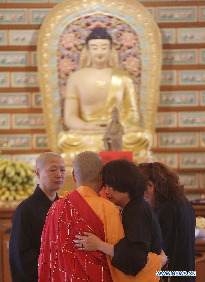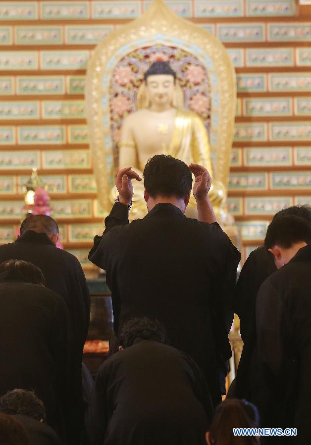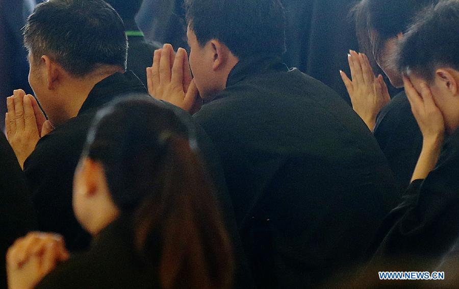 Chinese relatives of passengers on board the missing Malaysia Airlines Flight MH370 pray at the Fo Guang Shan Buddhist temple in the State of Selangor, Malaysia, on March 31, 2014. (Xinhua/Wang Shen)