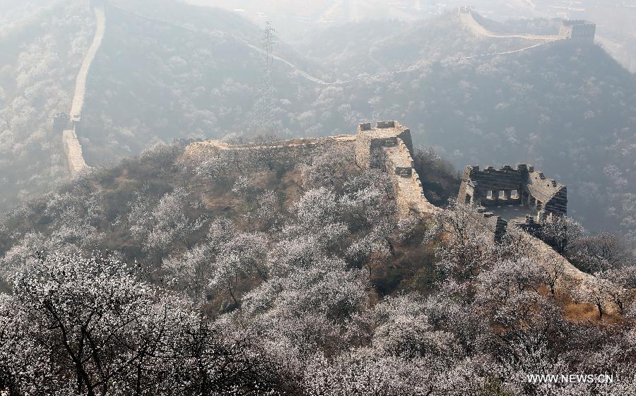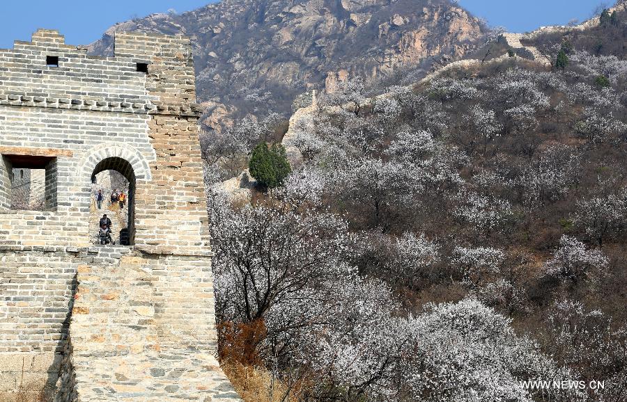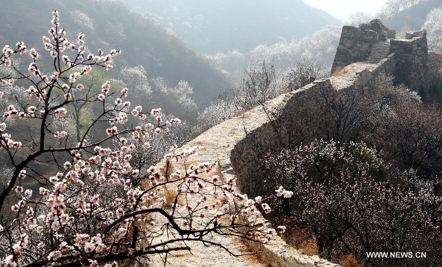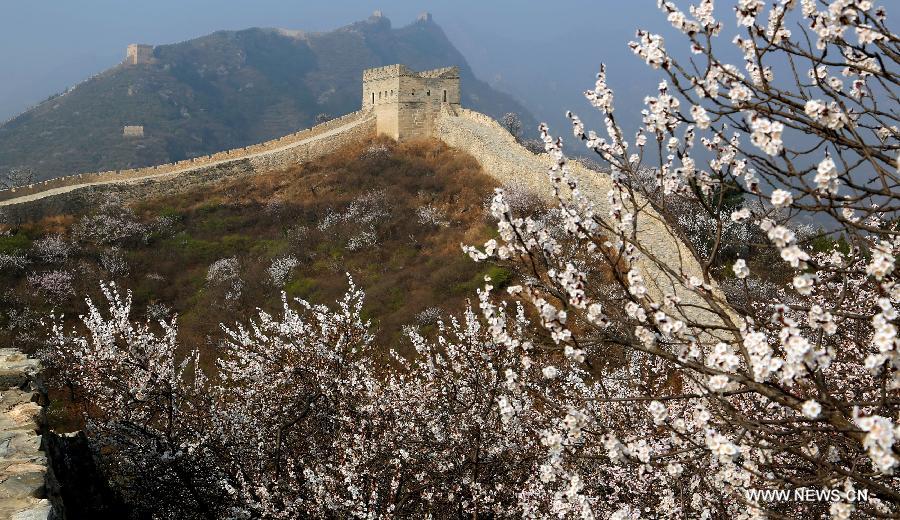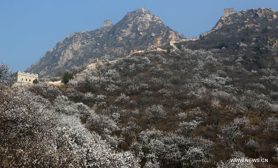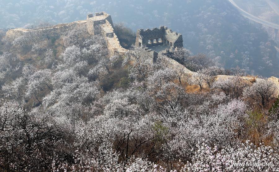 Photo taken on April 1, 2014 shows the Great Wall amid flowers in the suburban district of Huairou in Beijing, capital of China.(Xinhua/Bu Xiangdong)