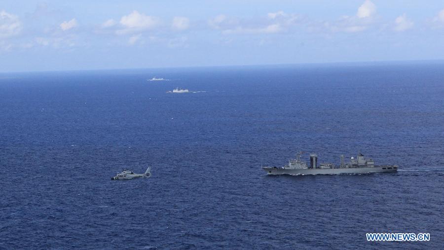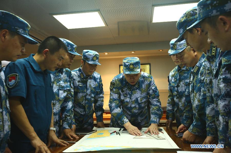 The 17th Chinese escort naval fleet heading for the Gulf of Aden and the waters off Somalia conduct search operation on April 1, 2014. The 17th Chinese escort naval fleet heading for the Gulf of Aden and the waters off Somalia reached its target area south of Christmas Island of Australia Tuesday to search for missing Malaysia Airlines Flight MH370. (Xinhua/Ding Yubao)