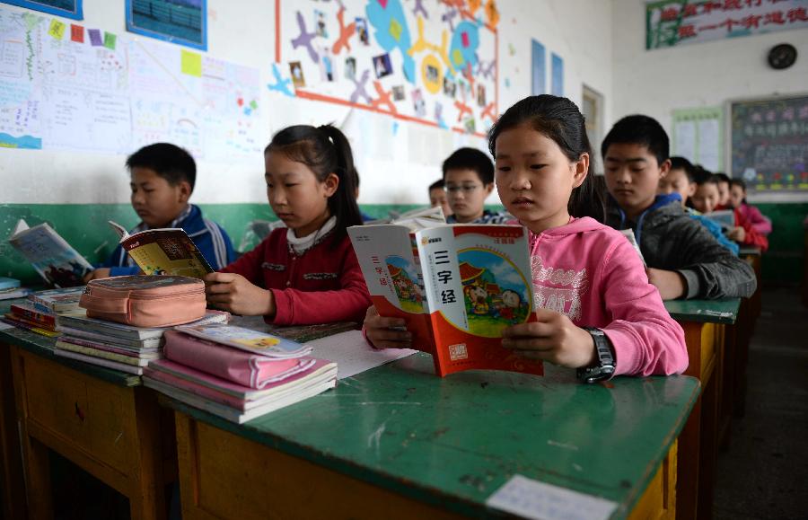 Pupils read books at the Fourth Primary School in Gu'an County, north China's Hebei province, April 2, 2014. The school on Wednesday organized a reading activity themed on "Making reading a habit" on the International Children's Book Day, which falls on April 2 each year. (Xinhua/Wang Xiao)
