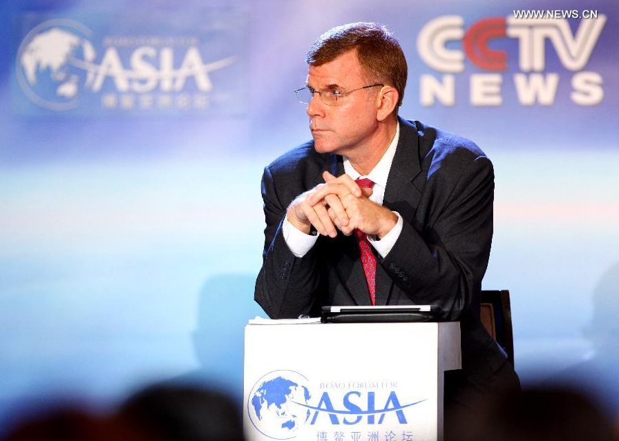 Honored guests communicate at a TV Debate named "Reshaping Finance & Trade in Asia" during the Boao Forum for Asia (BFA) Annual Conference 2014 in Boao, south China's Hainan Province. The forum will be held from April 8 to 11. (Xinhua/Wang Jingqiang)