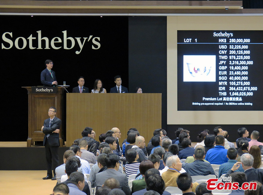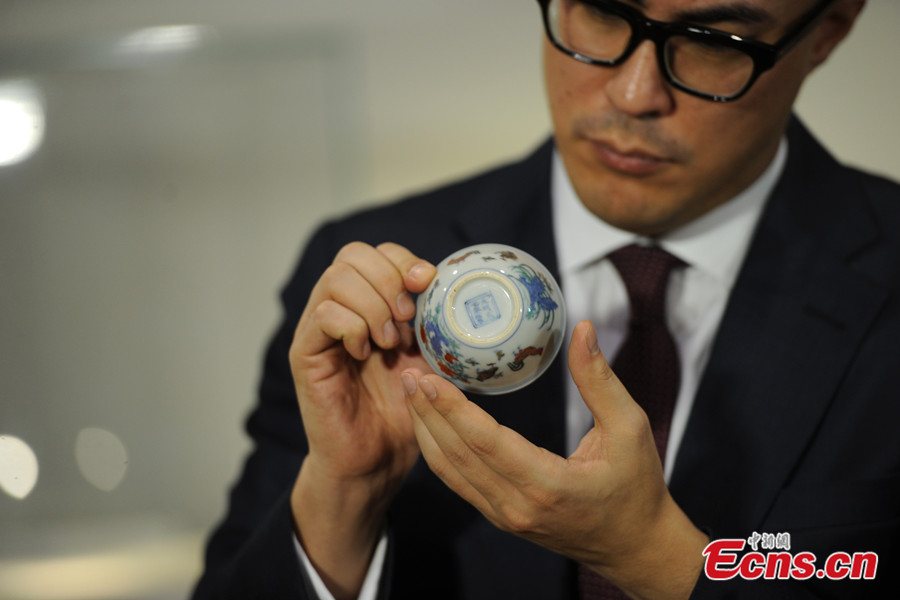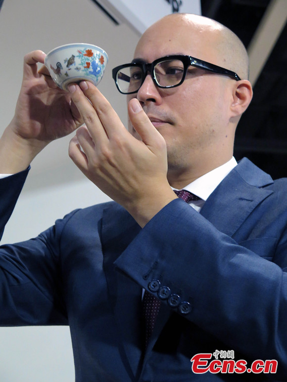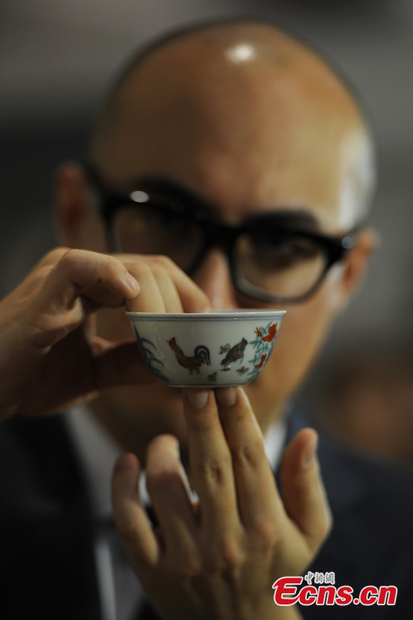 An 8.2-centimeter-tall porcelain cup from the Ming Dynasty (1368-1644), known as a "chicken cup", fetches HK$281.24 million ($36 million) at a Sotherby's auction in Hong Kong on Tuesday. It set a new record for Chinese porcelain at auction. [Photo: China News Service / Jia Siyu]