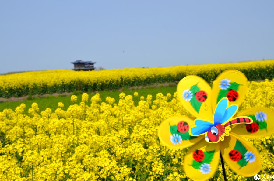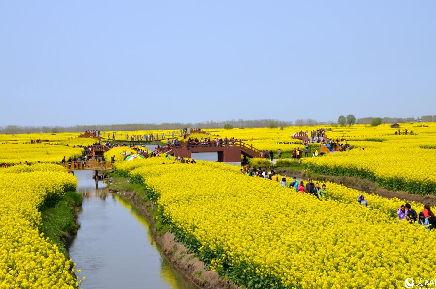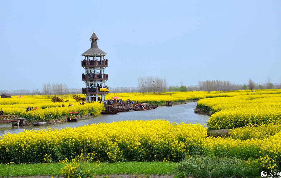 Located in Dongwang Village, Xinghua City of Taizhou, east China's Jiangsu province, the rape flowers scenic area boasts a unique view - the rape flower fields are cut into different pieces by rivers. Rivers, rape flower fields, and boats make the area known as "Thousand-Islet rape flower field".