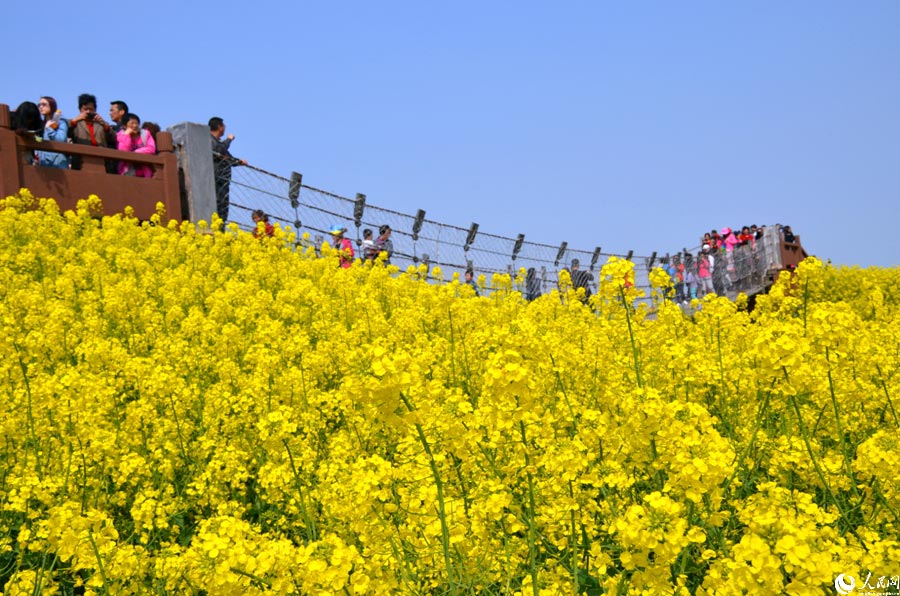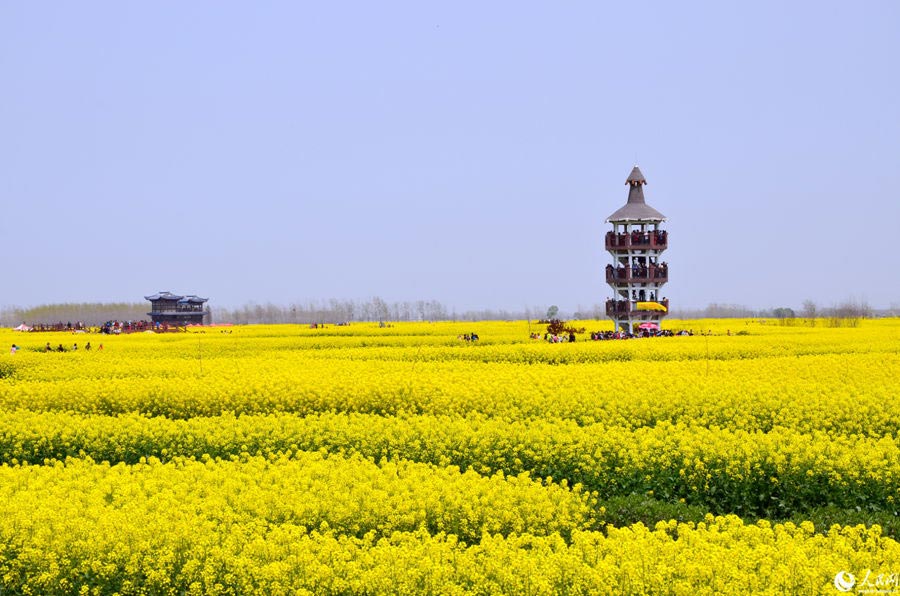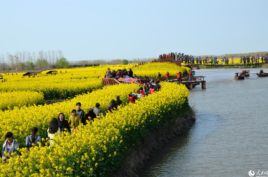 Tourists enjoy the scenery of rape flowers in Xinghua City of Taizhou, east China's Jiangsu Province, April 5, 2014. Last Saturday was the first day of the three-day break for Qingming Festival. Tens of thousands of people came to Taizhou to spend their holiday among the scenery of rape flowers. (People's Daily Online/Du Mingming)