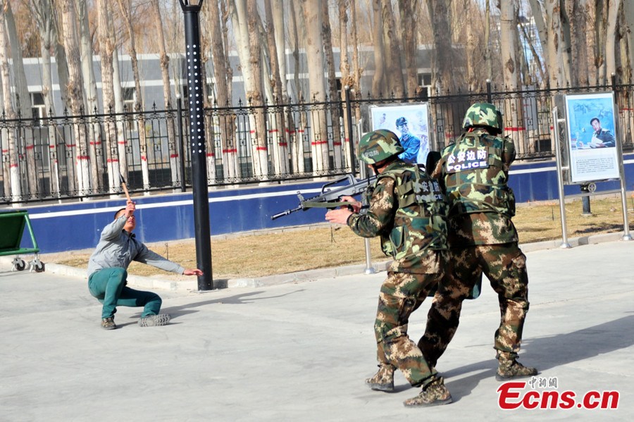 Police from a frontier police station in Xinjiang Uygur autonomous region attend an anti-terror drill on Wednesday with a focus on quick use of weapons in emergencies. Since the end of 2013, Xinjiang has launched a three-year campaign in which local police are trained in anti-terror tactics. The campaign is aimed at the local police forces because they are large in number, widespread in the region, and work on the frontlines. The drills are meant to improve the region's overall preparedness and response in such events. [Photo/Fan Xinyu]