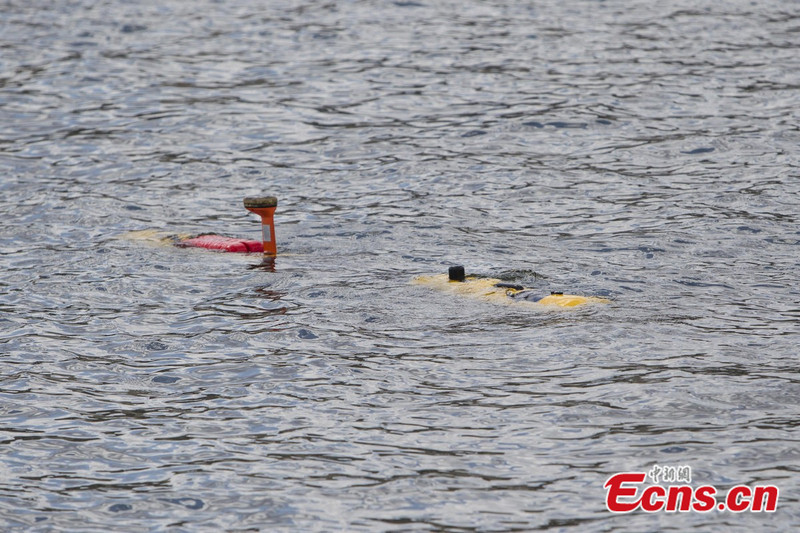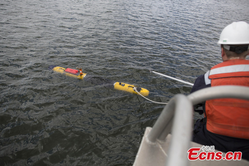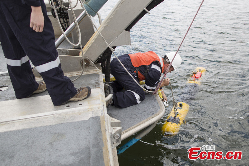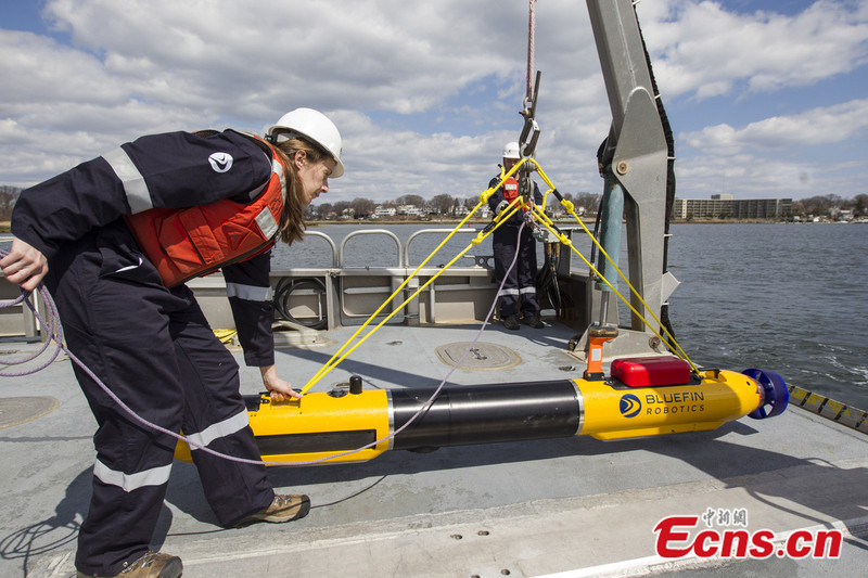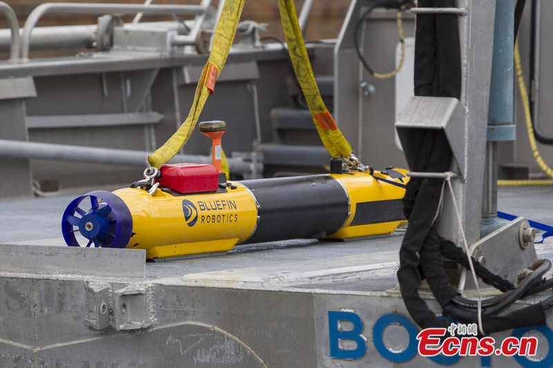 Photo taken on April 9, 2014 shows an autonomous underwater vehicle (AUV), named "Tuna", at Quincy in Massachusetts, the United States. The autonomous underwater vehicle is designed for deep-sea surveying. It's 5m long and weighs about 800kg. It has a depth rating of 4,570 meters, meaning it will be at its limit in the Indian Ocean search zone. [Photo/IC]
