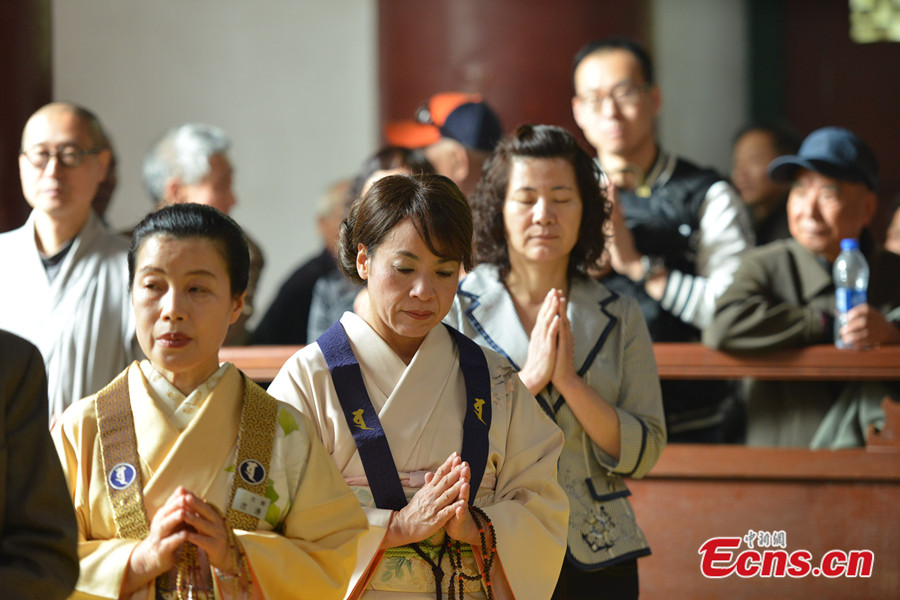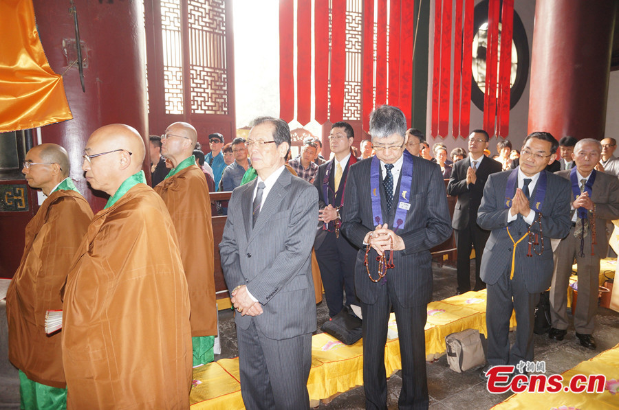 Monks from China and Japan pray for world peace at an assembly in Lingyin Temple of Hangzhou, Zhejiang province on April 9, 2014. [Photo: China News Service / Li Chenyun]
