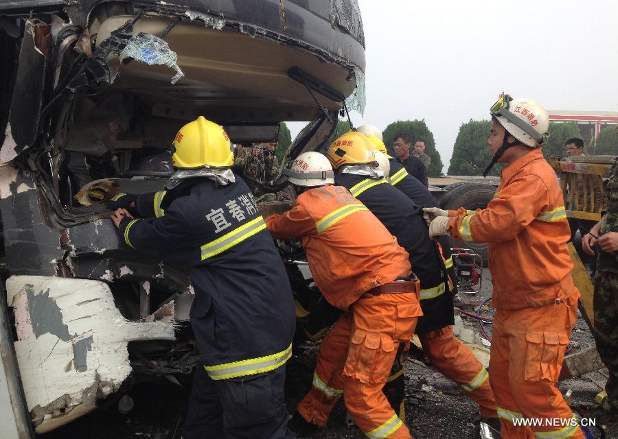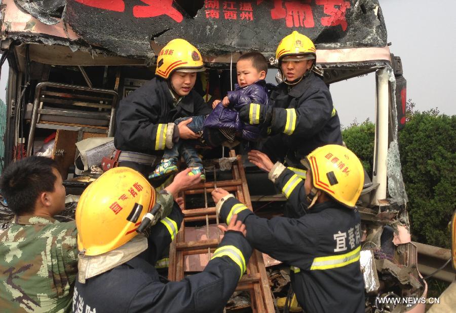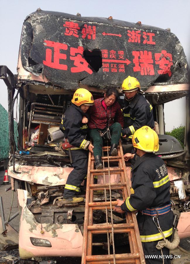 Rescuers work at an accident site on Hukun expressway that links Shanghai with Kunming, in Changzhang, east China's Jiangxi Province, April 9, 2014. At least three people were killed on Wednesday morning in a pileup that involved more than 10 vehicles on the fog-blanketed highway, a source with the provincial department of transport told Xinhua. (Xinhua/Tao Lin)