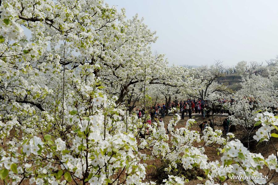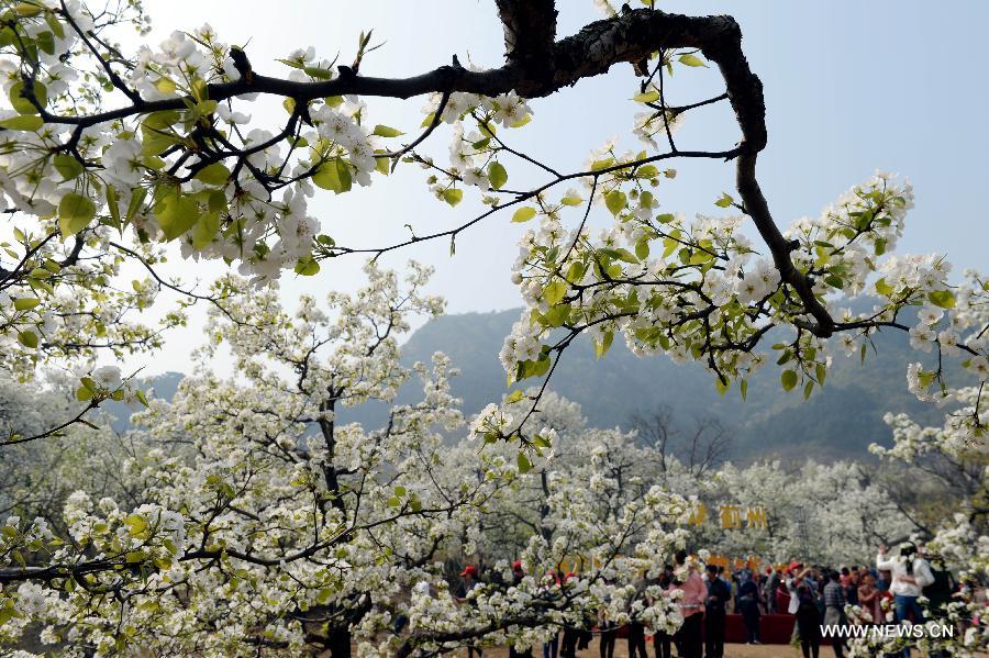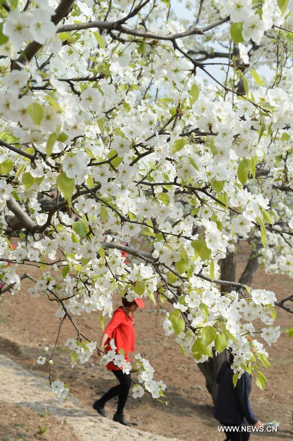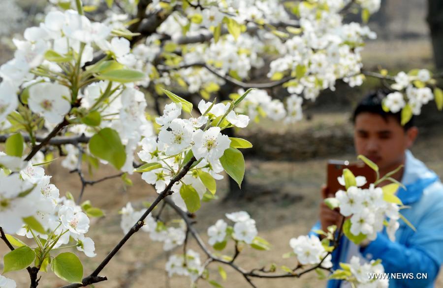 A tourist takes photos of pear blossoms during a pear park cultural festival at Jixian County, north China's Tianjin Municipality, April 9, 2014. The pear park cultural festival kicked off here Wednesday. (Xinhua/Wang Kun)