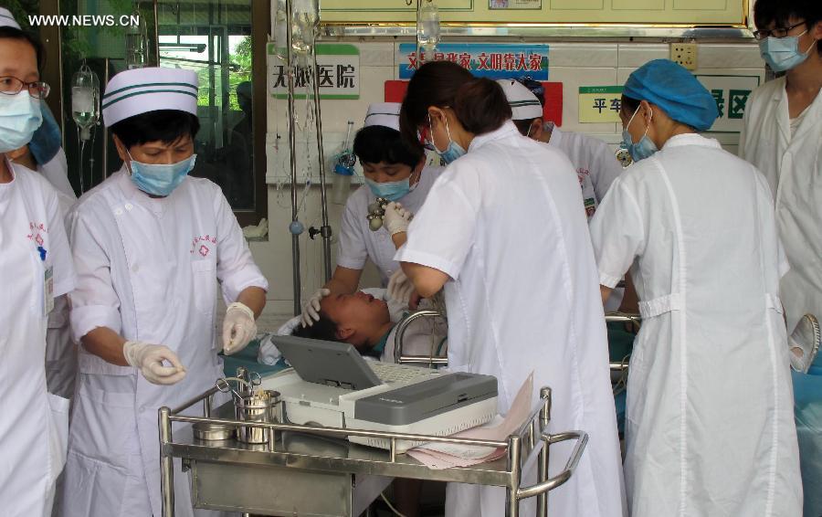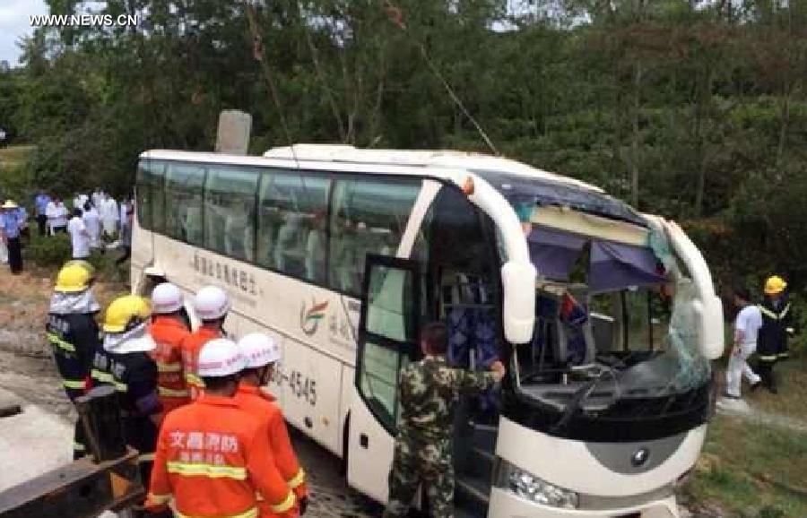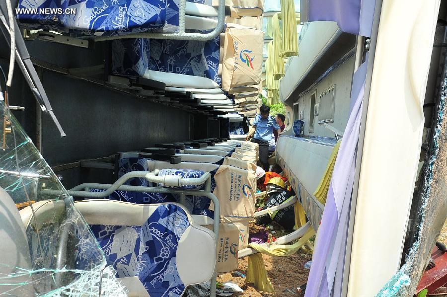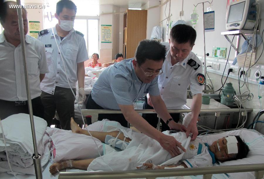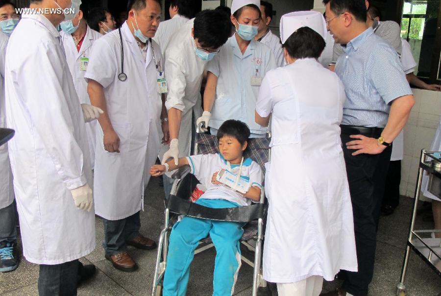 Medical workers give treatment to injured passengers of a bus overturn accident in Wenchang City, south China's Hainan Province, April 10, 2014. Eight pupils died and 32 were injured when their bus for spring outing overturned in Chengmai County of Hainan Province on Thursday morning. All the injured have been sent to hospital and the cause of the accident is under investigation. (Xinhua/Chen Fei)