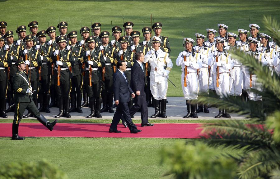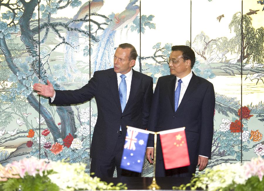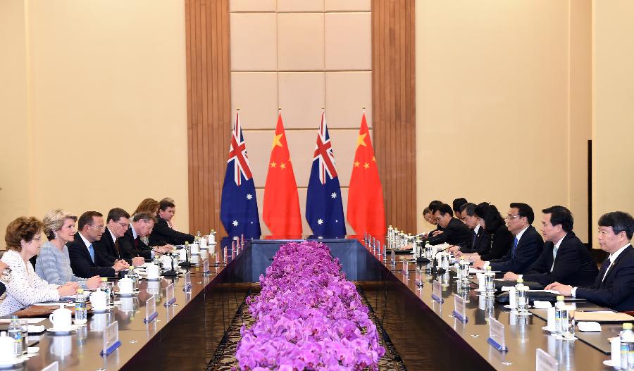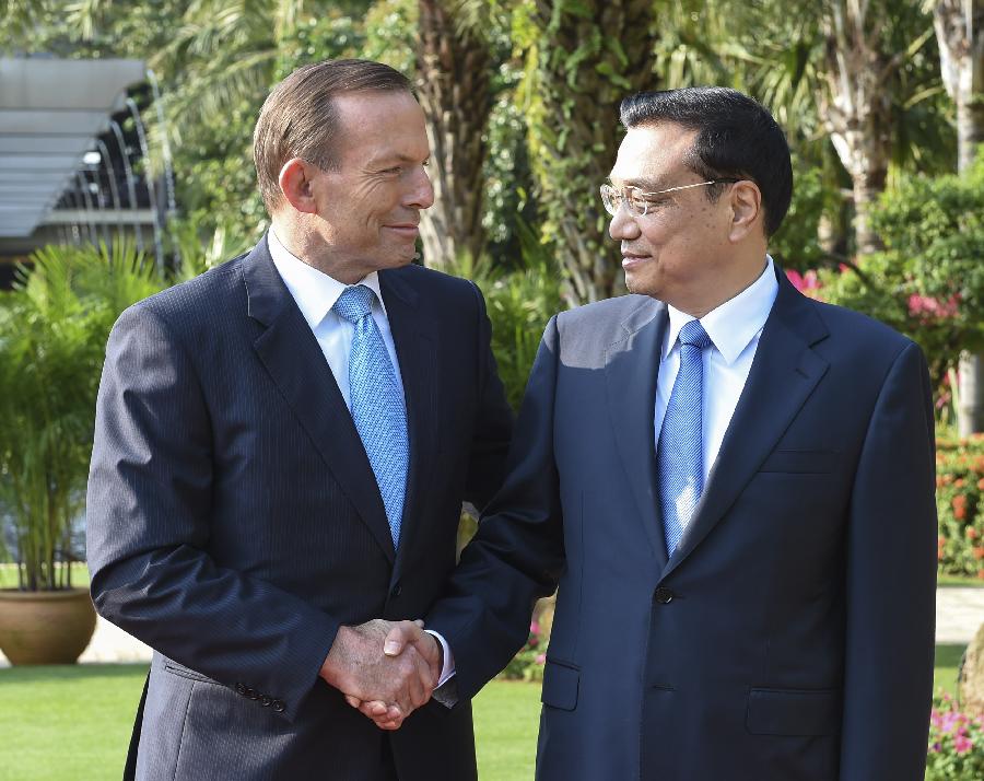 Chinese Premier Li Keqiang (R) shakes hands with Australian Prime Minister Tony Abbott during the annual talks between the two countries' government leaders, in Sanya City, south China's Hainan Province, April 9, 2014. China and Australia have agreed to accelerate negotiations on a bilateral free trade deal during annual talks between the two prime ministers. (Xinhua/Li Xueren)