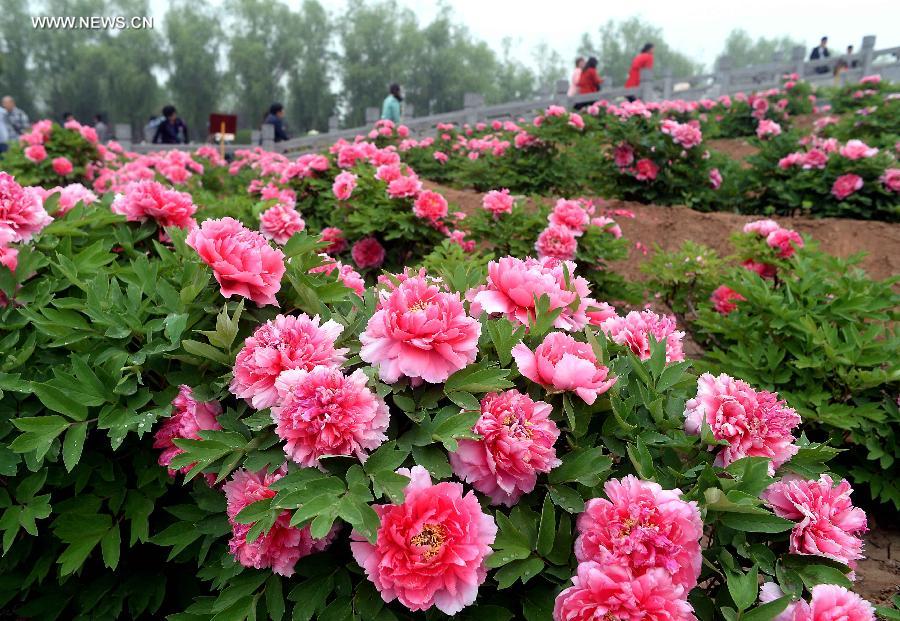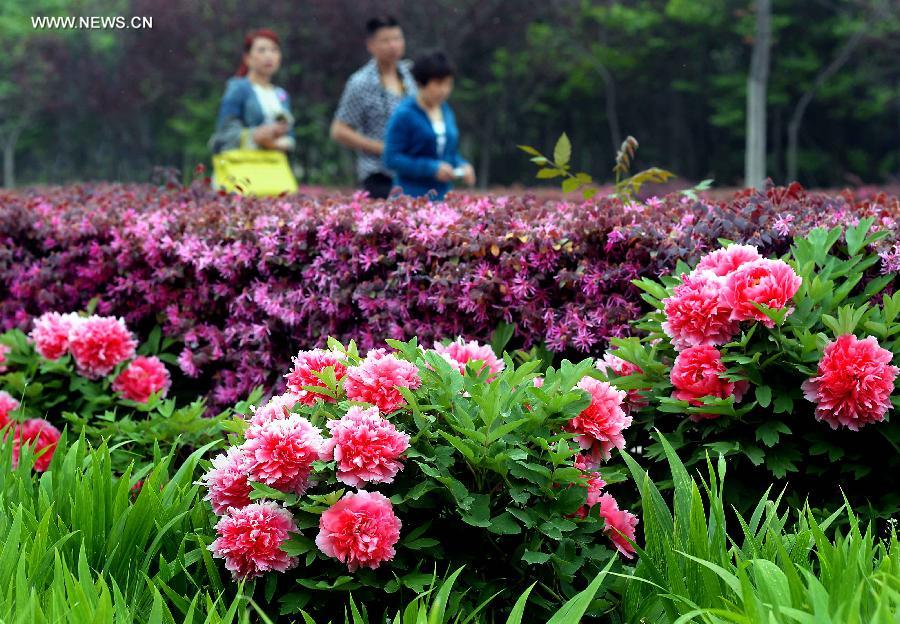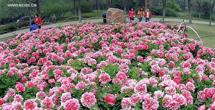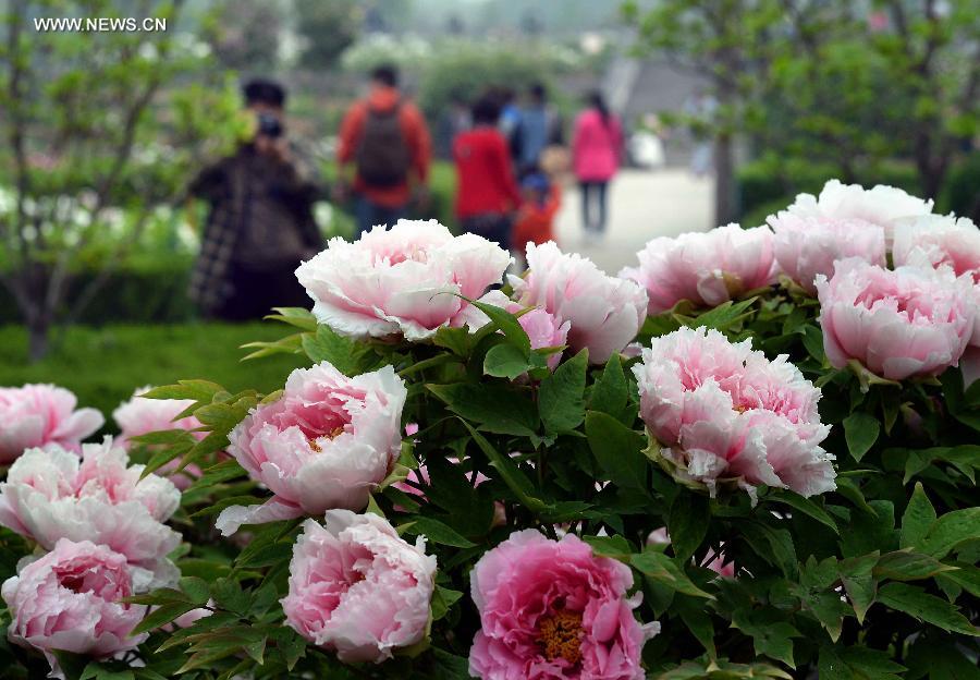 Tourists walk in a garden with peony flowers in Luoyang, central China's Henan Province, April 10, 2014. (Xinhua/Wang Song)