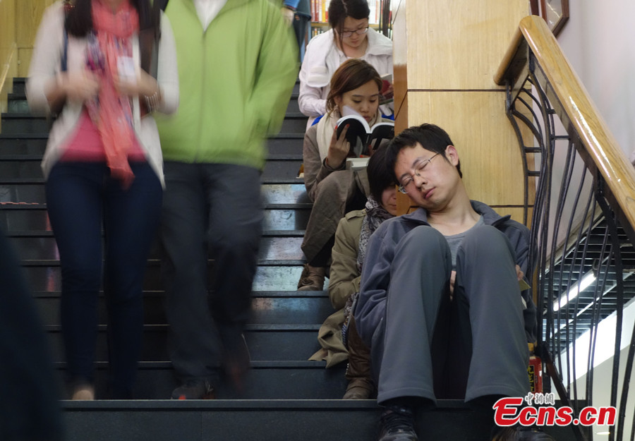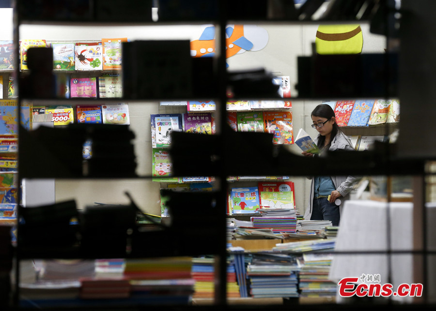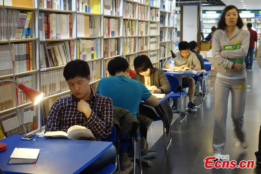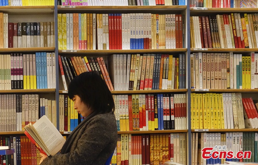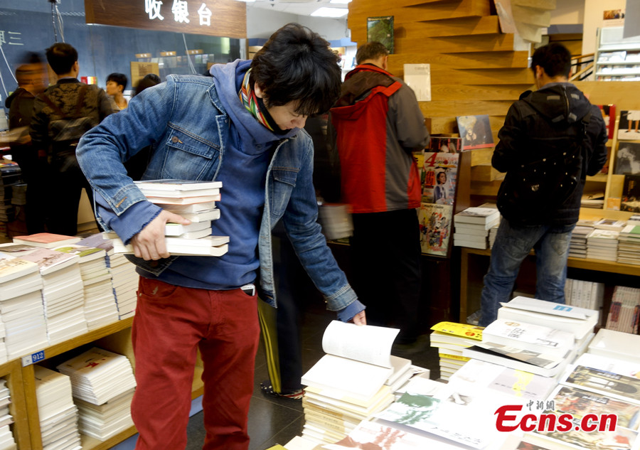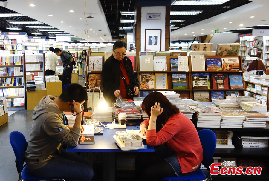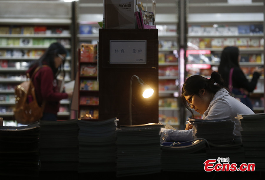 A reader reads a book at the Sanlian Taofen Bookstore in Beijing, capital of China, around midnight on April 10, 2014. The Sanlian Taofen Bookstore tried to open 24 hours a day on Tuesday. Established in 1996, the bookstore is in the Dongcheng District of downtown Beijing. [Photo: China News Service / Du Yang]