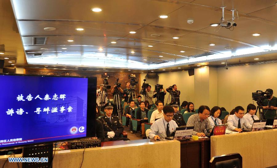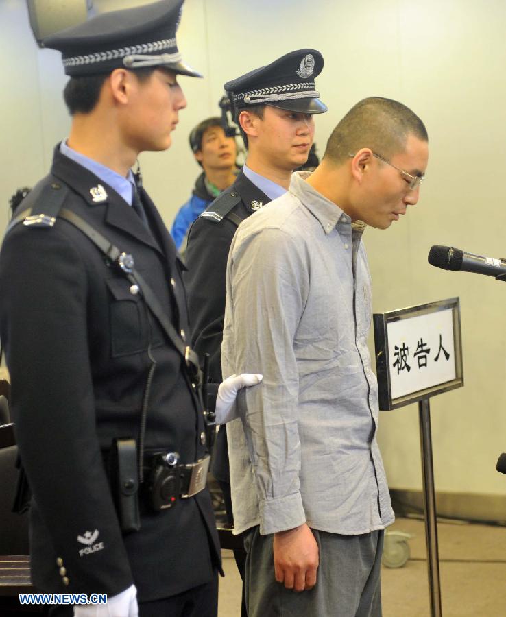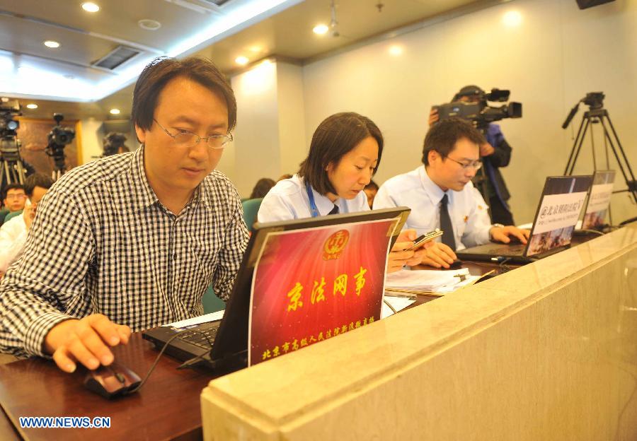 Qin Zhijun, an alleged rumormonger, stood trial at the Chaoyang District People's Court in Beijing, capital of China, April 11, 2014. Qin Zhihui, known as "Qinhuohuo" in cyberspace, was accused of creating and spreading rumors about several Chinese celebrities including popular TV hostess Yang Lan, as well as China's former Ministry of Railways, via Sina Weibo, China's Twitter-like service, from December 2012 to August 2013, according to prosecutors. (Xinhua/Gong Lei)
