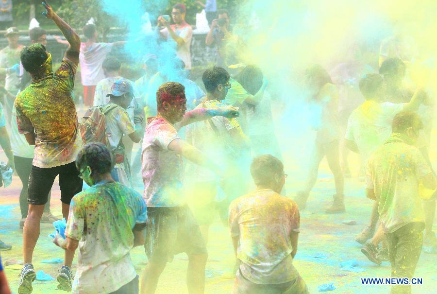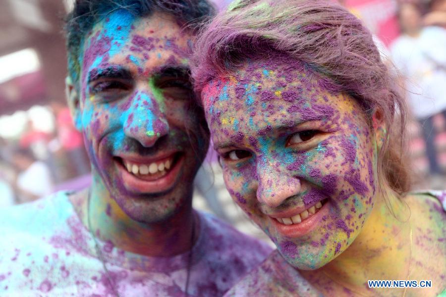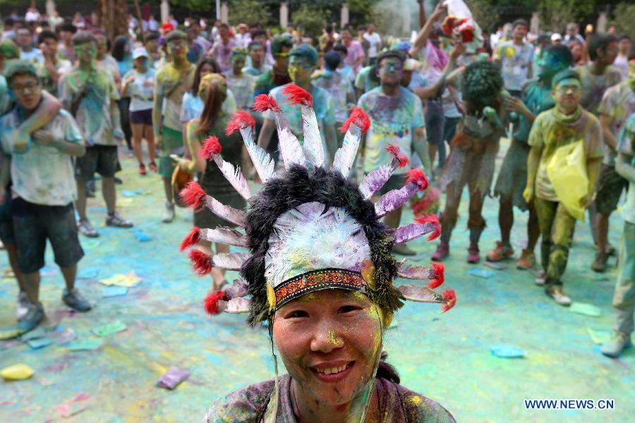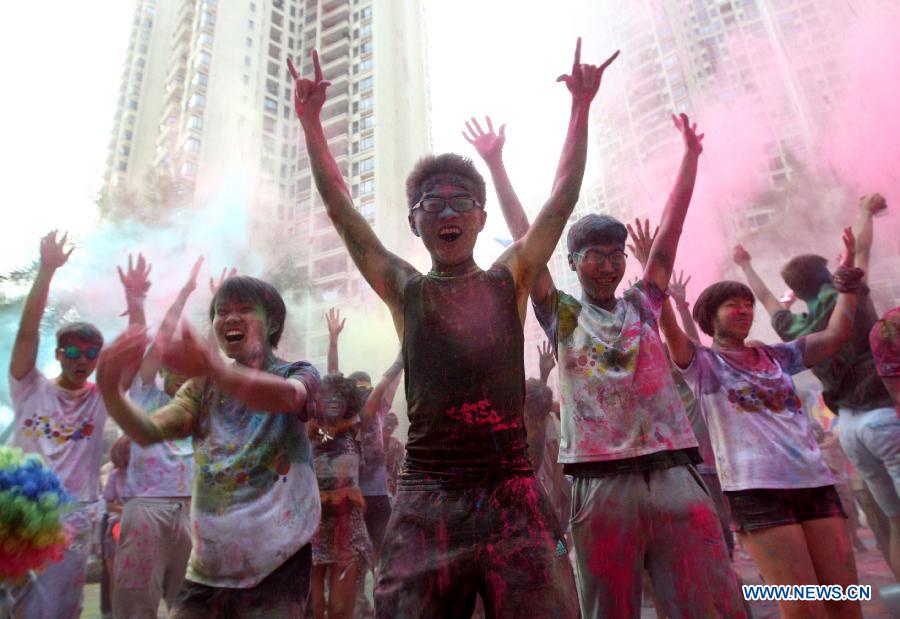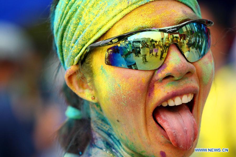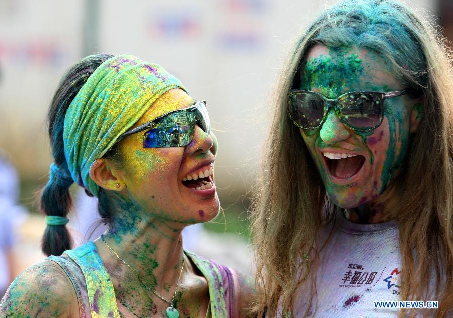 Participants pose for photos during "The Color Run" in Dongguan, south China's Guangdong Province, April 12, 2014. The Color Run is a 5-kilometer, un-timed race in which thousands of participants, or "Color Runners", are doused from head to toe in different colors at each kilometer. (Xinhua)