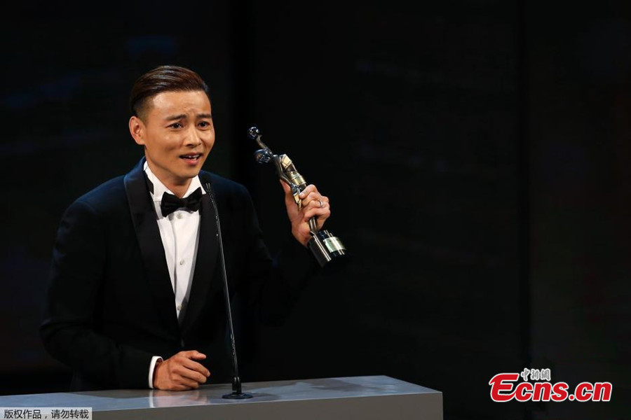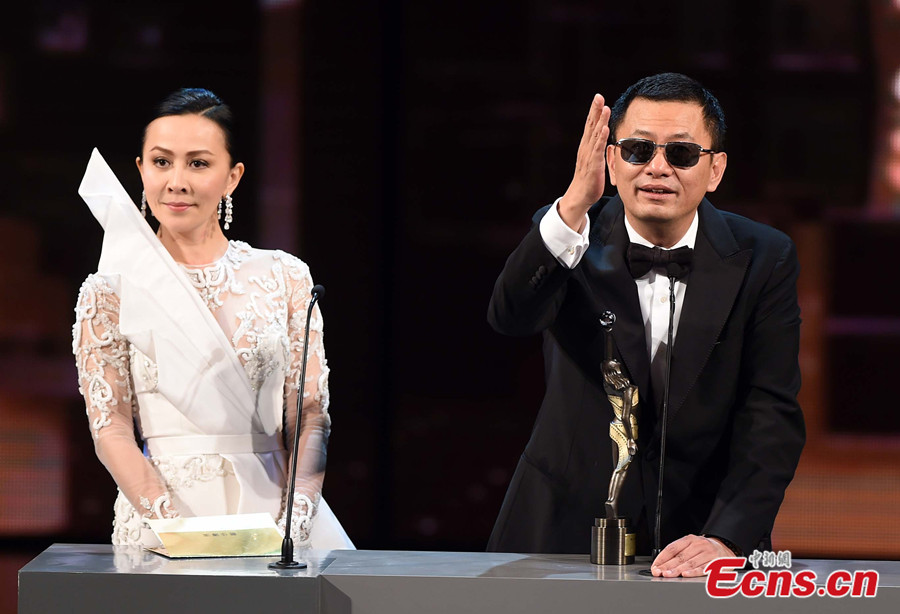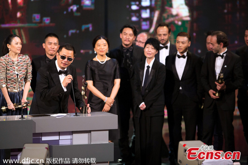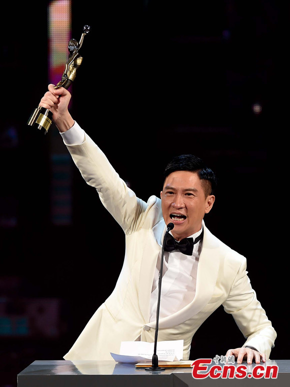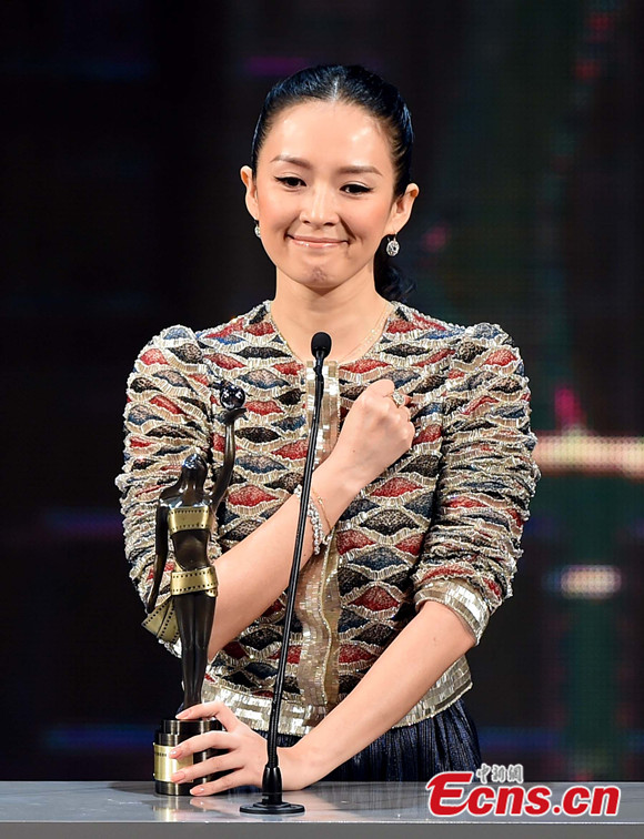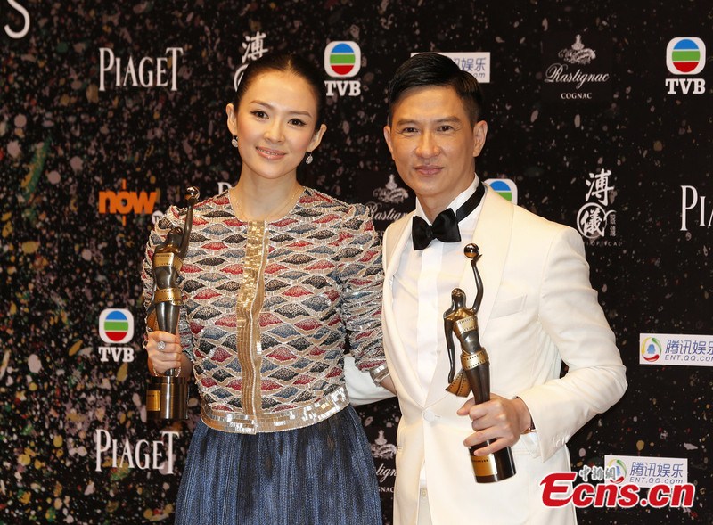 Zhang Ziyi (L) and Nick Cheung pose for photos at the 33rd Hong Kong Film Awards on April 13, 2014. Zhang wins the Best Actress for her performance at The Grandmaster and Cheung wins the Best Actor for Unbeatable. [Photo/IC]