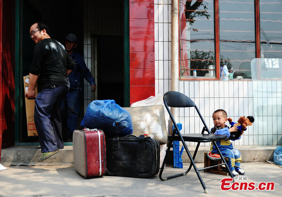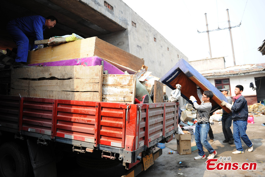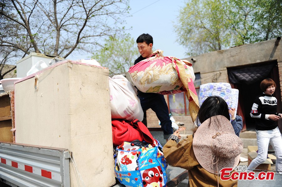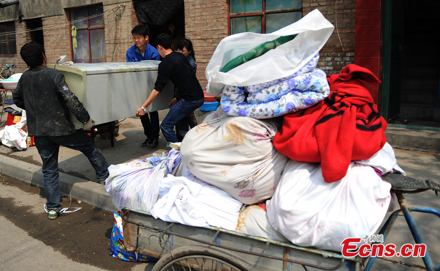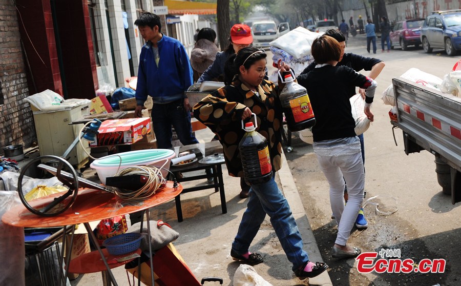 People move furniture and daily necessities to make way for a water pipeline replacement project in Lanzhou of northwest China's Gansu province on April 15, 2014. More than 90 households are relocated to improve the efficiency of reconstruction after a water pollution incident. Local government has allocated new apartments and compensation of cashes to those agree to relocate. Reconstruction work is expected to start in late April and end in mid May. Excessive levels of benzene were reported in Lanzhou's tap water on April 11, 2014. The tap water contamination affected more than 2.4 million people in Lanzhou. [Photo/Yang Yanmin]