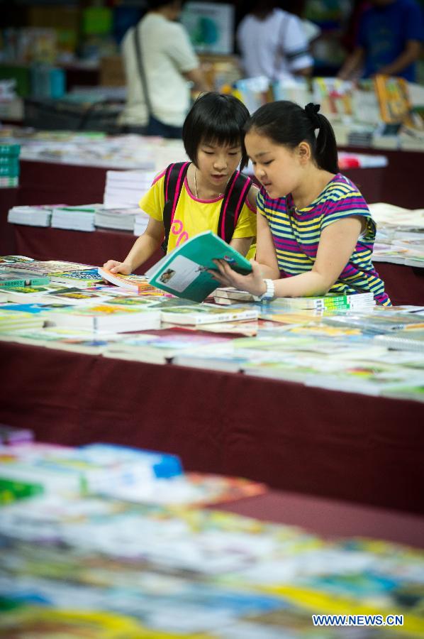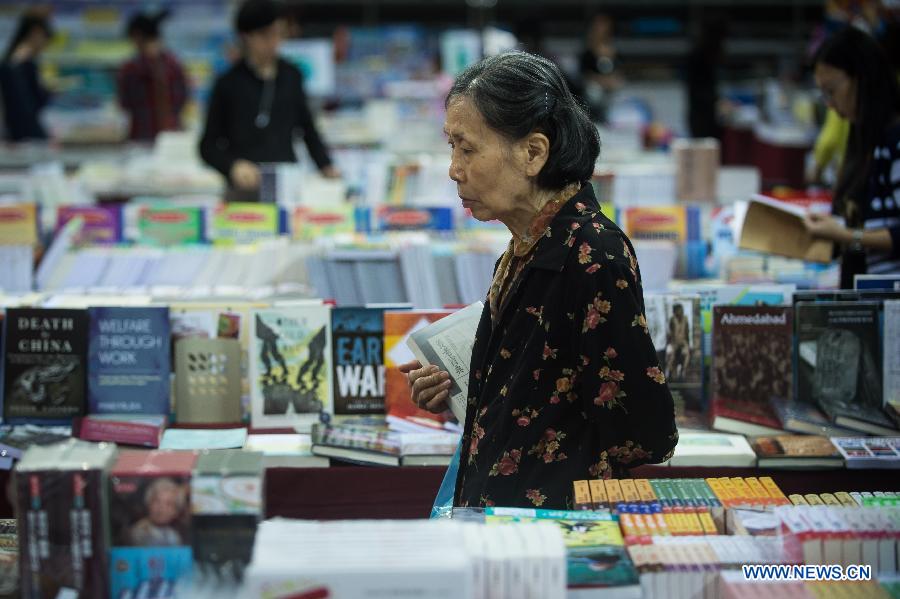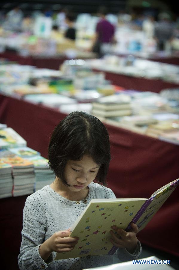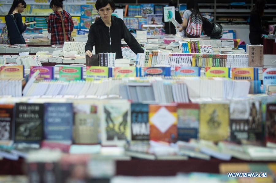 A girl selects books at the Macao Spring Book Fair in Macao, south China, April 17, 2014. About 120 thousands kinds of books, audio and vedio products are provided for consumers on the book fair which kick off on Thursday.(Xinhua/Cheong Kam Ka)