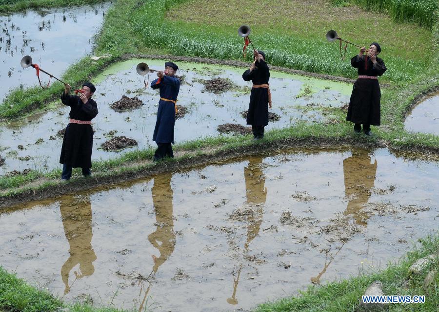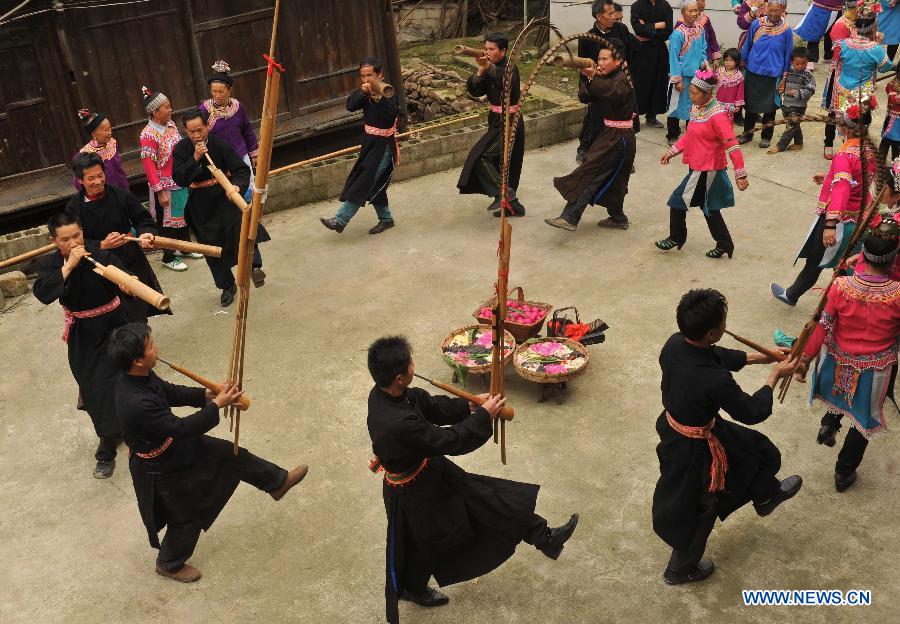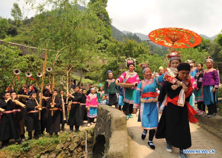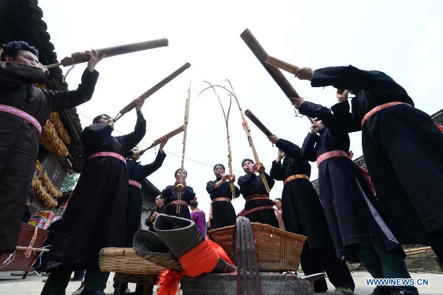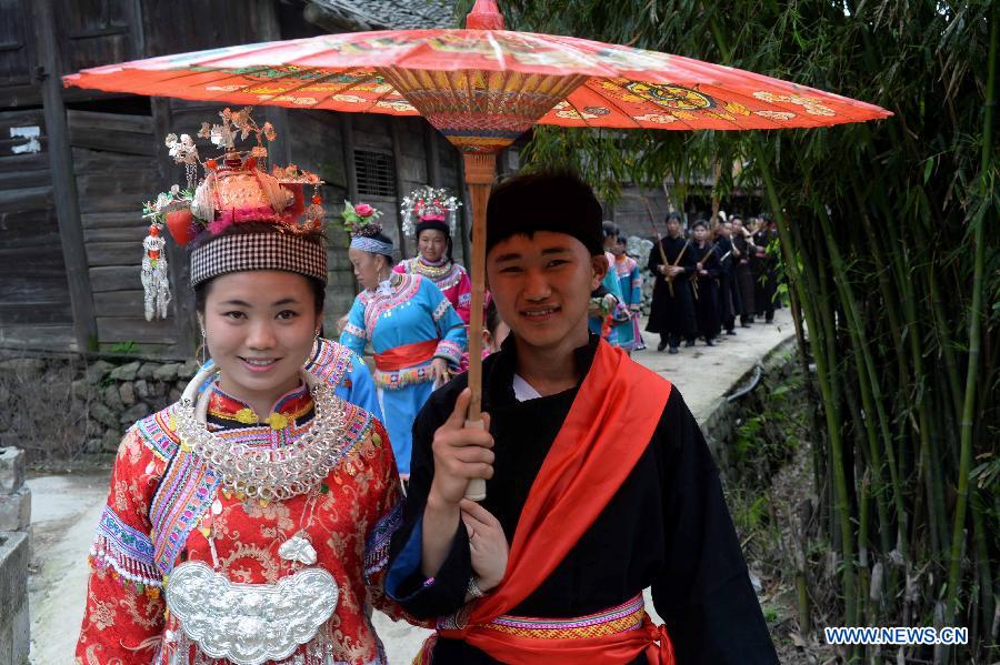 People of Miao ethnic group perform local wedding ceremony for tourists in Xinchang Village, Wangsi Township of Duyun City, southwest China's Guizhou Province, April 16, 2014. Over 60 villagers were involved in the performance showcasing their folk ritual here on April 16. (Xinhua/Qiao Qiming)