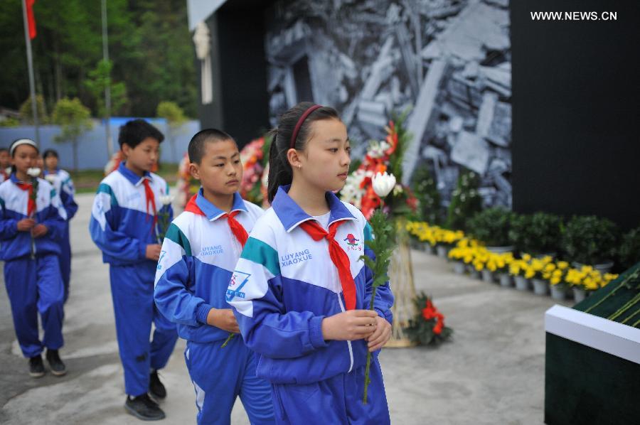People attend a mourning ceremony to mark the first anniversary of the Lushan earthquake at the Longxing central school in Longmen Township of Lushan County, southwest China's Sichuan Province, April 20, 2014. The 7.0 magnitude earthquake hit Lushan on April 20, 2013, killing 196 people and injuring over 11,000 others. (Xinhua/Xue Yubin)