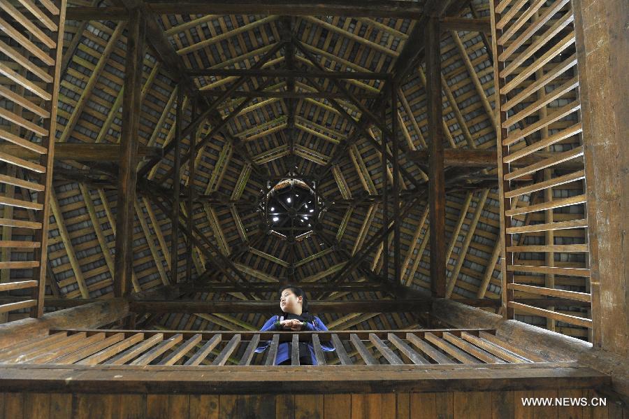 A tourist enjoys the view inside a drum tower in Bajiao of Enshi City, central China's Hubei Province, April 20, 2014. Dong drum tower is the symbol of the architectures of Dong ethnic group. The drum towers can be mostly seen in central China's Hunan and Hubei provinces, south China's Guangxi Zhuang Autonomous Region and Guizhou province, where Dong ethnic group is distributed. Dong drum towers are mainly folk public buildings, containing folk customs and features. (Xinhua/Xie Shun)