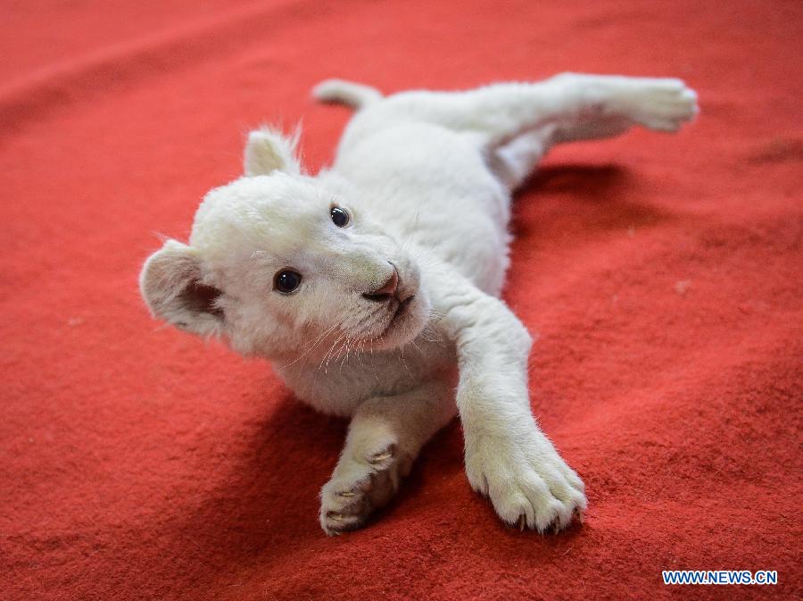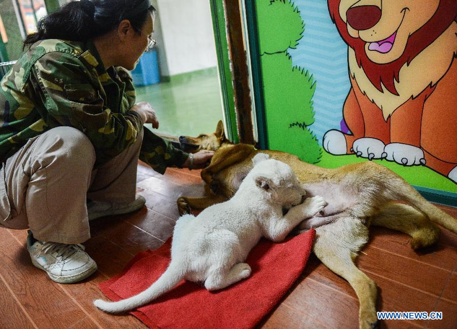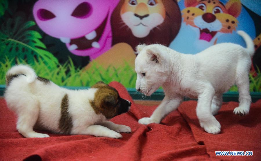 A two-month-old white lion plays with a puppy at a wildlife park in Hangzhou, capital of east China's Zhejiang Province, April 21, 2014. The white lion cub was born in Hangzhou in February. As its mother refused to feed the cub, a dog was brought here by staff members as its wet nurse. (Xinhua/Xu Yu)