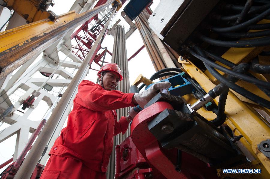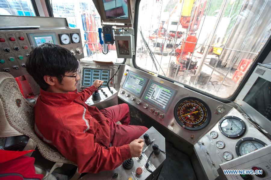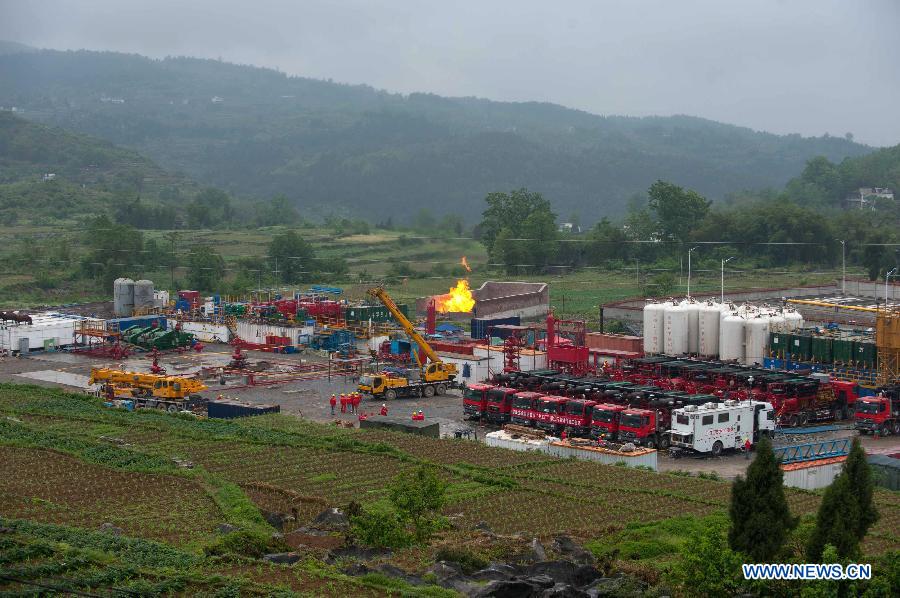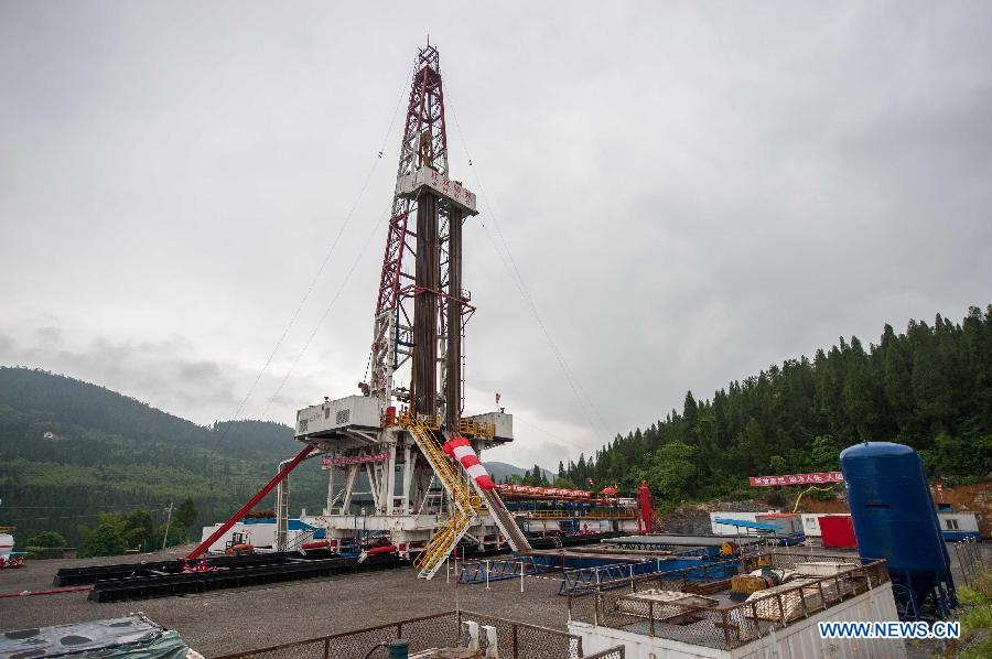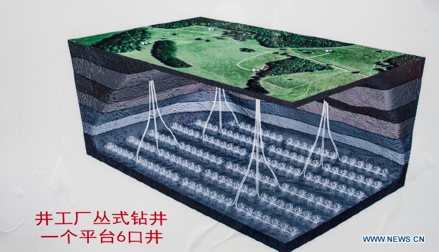 Photo taken on April 21, 2014 shows an illustration of the late-model shale gas drilling well at the Fuling work zone in a branch company of Sinopec, China's largest oil refiner, in Chongqing, southwest China. The daily shale gas output in southwest China's Fuling work zone has exceeded 2.7 million cubic meters in April, setting a new record. (Xinhua/Liu Chan)