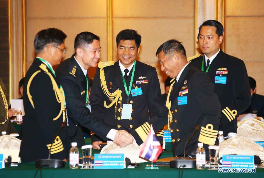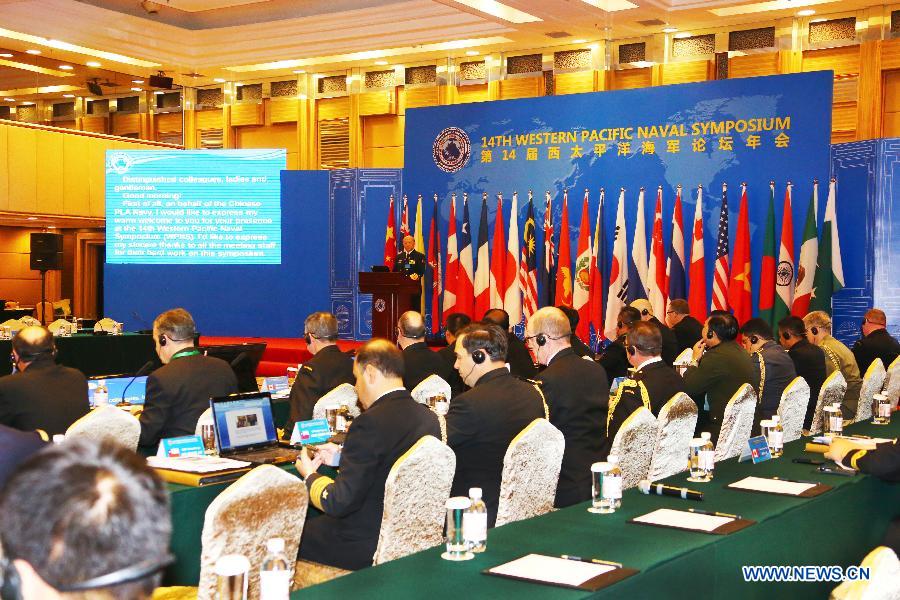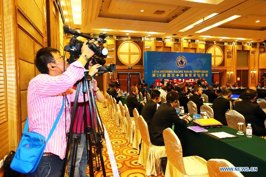 Delegates greet each other during the 14th Western Pacific Naval Symposium in Qingdao, east China's Shandong province, April 22, 2014. A biennial conference of the Western Pacific Naval Symposium opened in Qingdao Tuesday. (Xinhua/Zha Chunming)