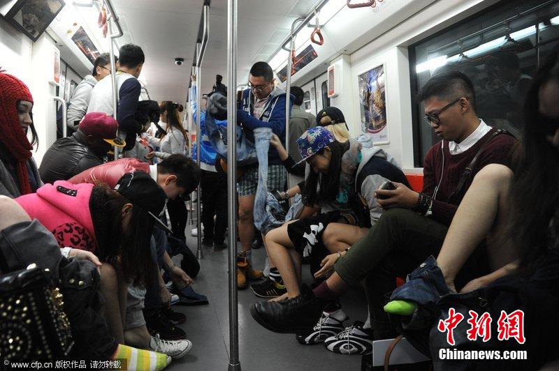 Over 40 pantless young persons and expats take a ride at Subway Line 1 in Harbin, capital city of northeast China's Heilongjiang province on April 22, 2014. Founded in 2002 by a New York-based prank collective called Improv Everywhere, "No Pants Subway Ride" has spread across the world. [Photo/CFP]