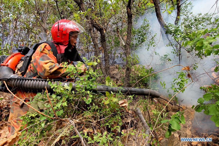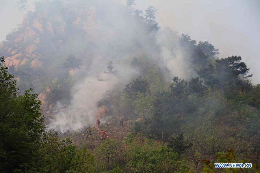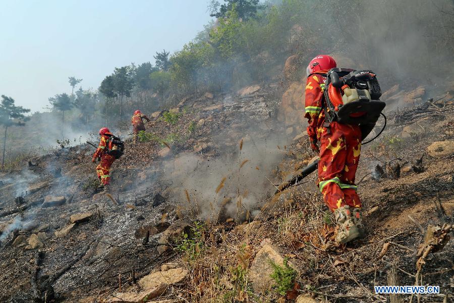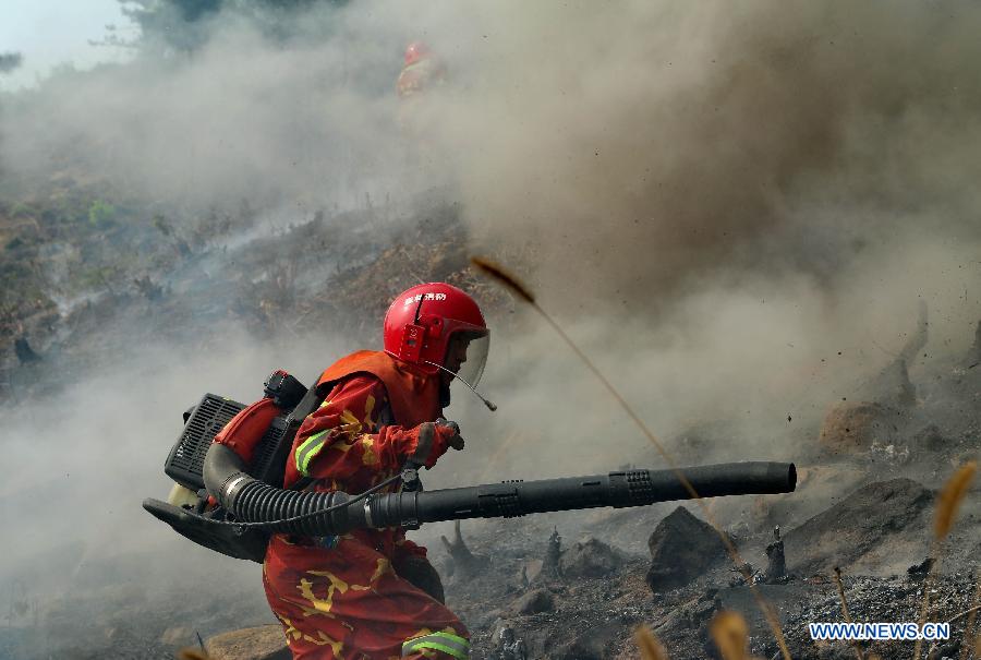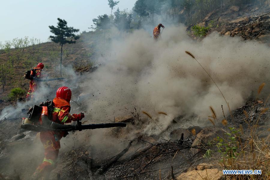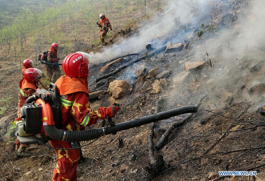 Firemen extinguish a blaze at a forest fire site in Funing, north China's Hebei Province, April 23, 2014. Forest fires occurred in Tianjiagou village and Xingxingyu village of Funing on Monday. (Xinhua/Yang Shirao)