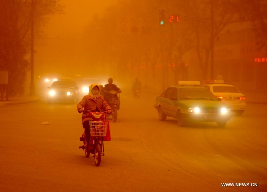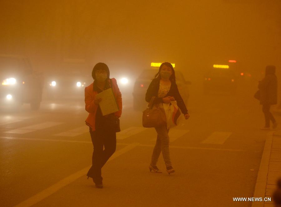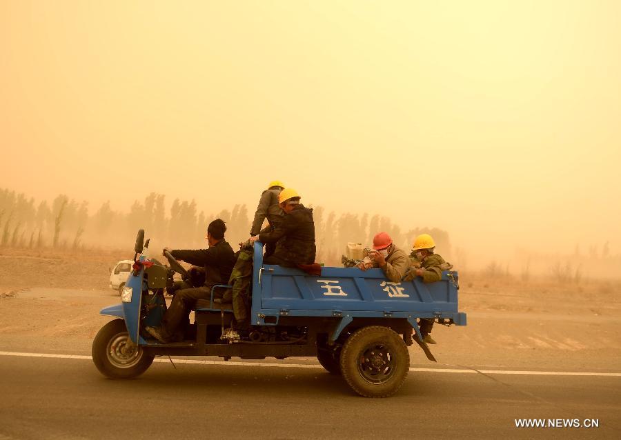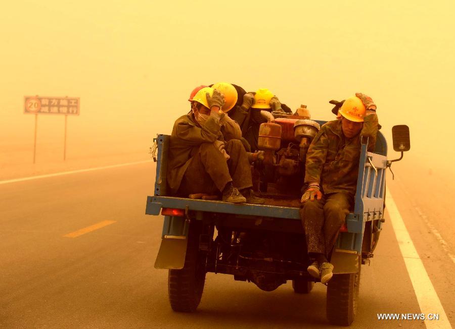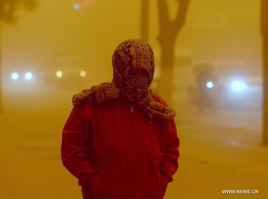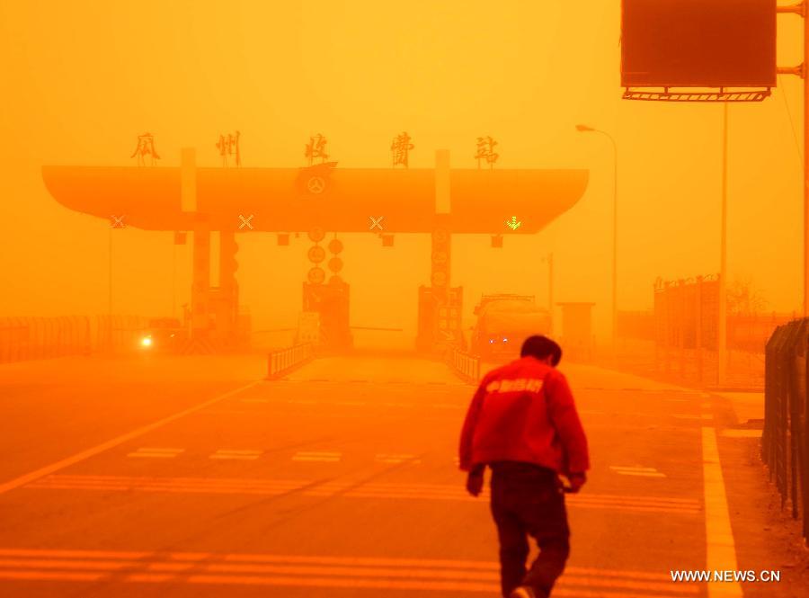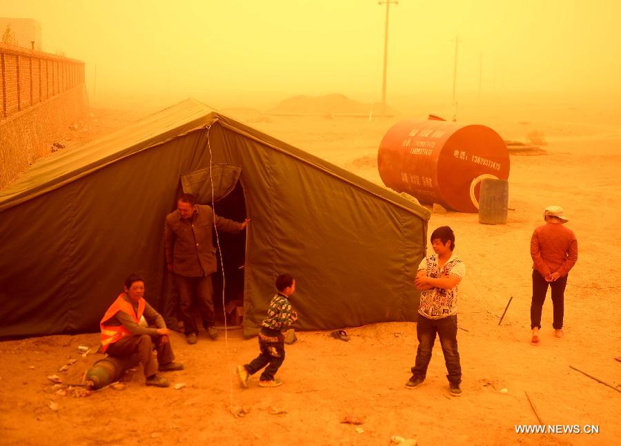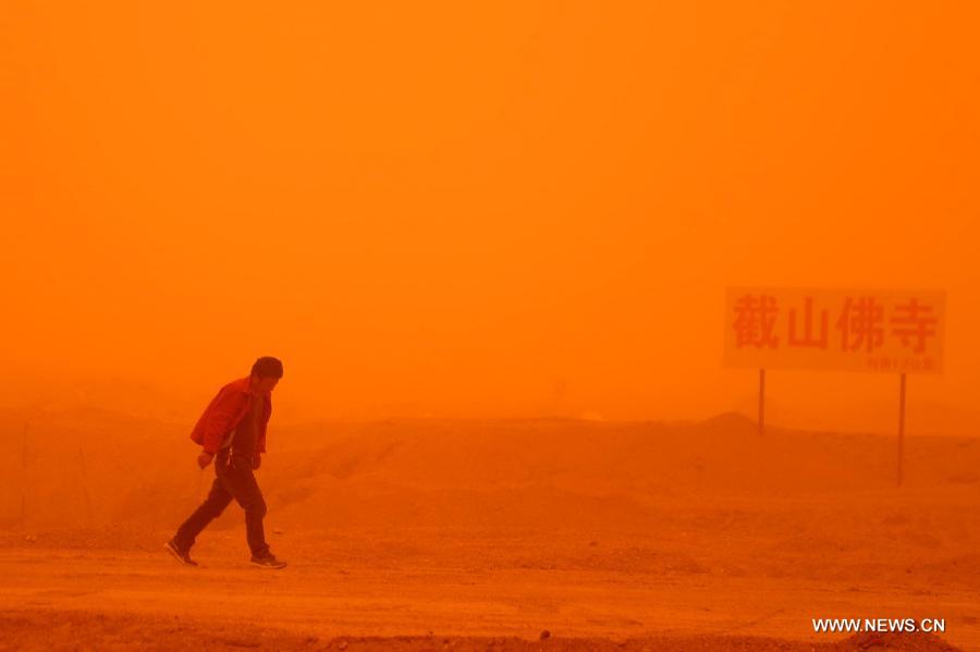 A man walks in a sandstorm at Guazhou toll station in Jiuquan, northwest China's Gansu Province, April 23, 2014. Parts of Gansu was hit by a sandstorm Wednesday afternoon, which reduced visibility to less than 50 meters, according to the provincial meteorological center. (Xinhua/Nie Jianjiang)