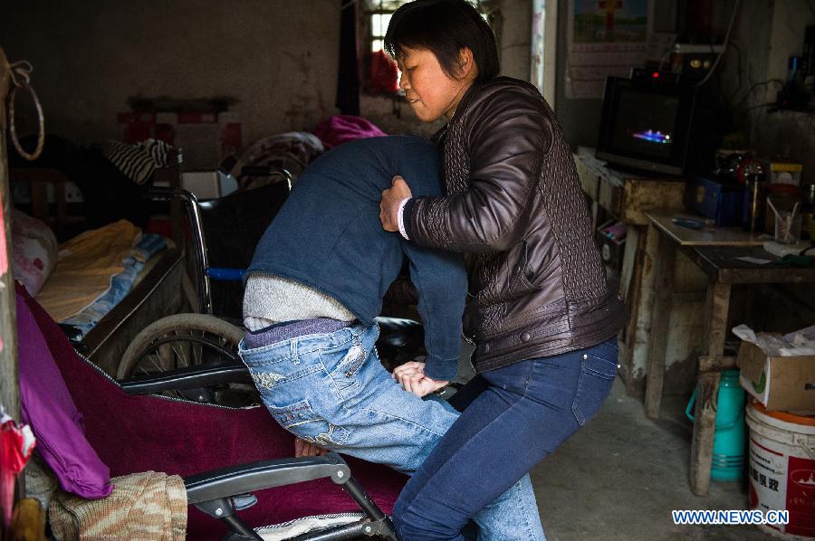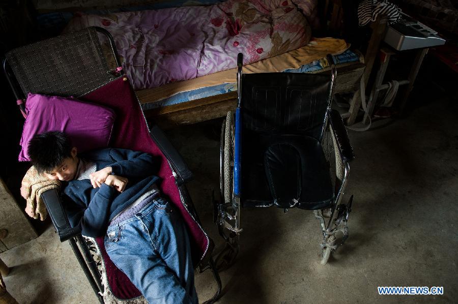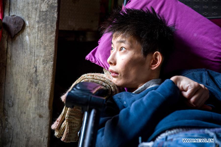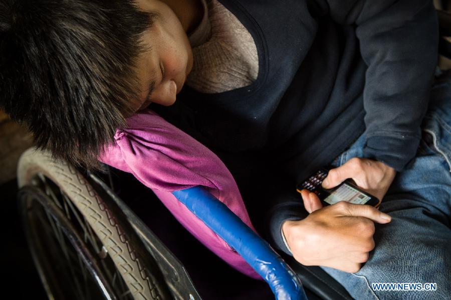 Liu Hailong browses micro-blogs using mobile phone in Zhuxiang township of Changfeng county in Hefei, capital of east China's Anhui Province, April 22, 2014. The official micro-blog of Hefei Evening News recently received a message from Liu Hailong, a poor 19 years old boy, which expressed his desire to donate his organs because he may not live for a long time for his serious disease. Liu Hailong suffers from congenital and hereditary muscular dystrophy which makes him act and speak difficultly. (Xinhua/Guo Chen)