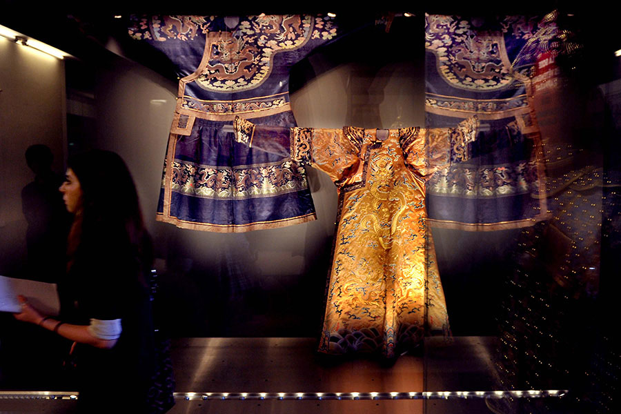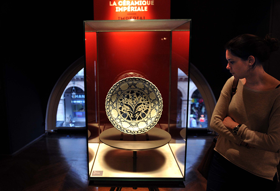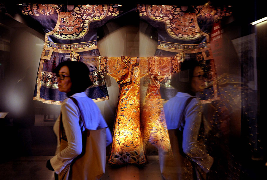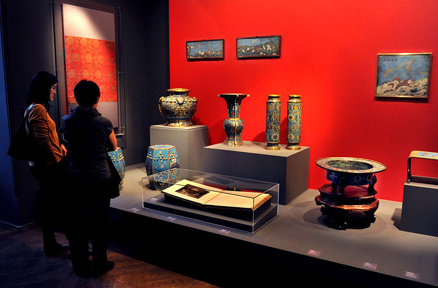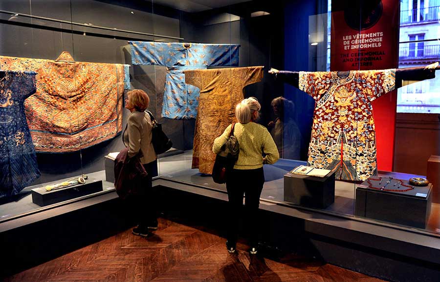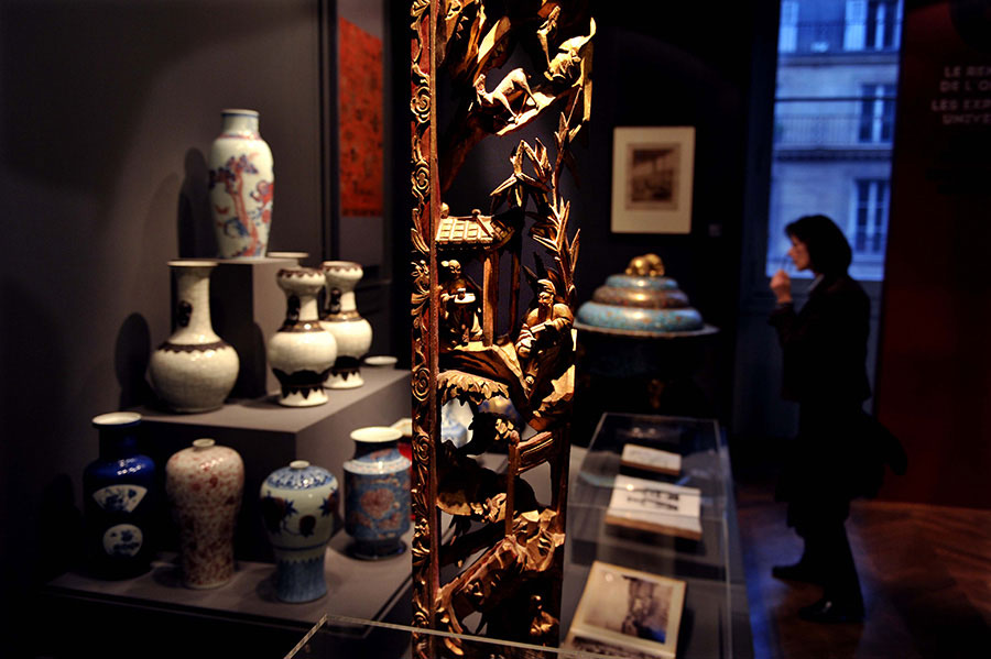 An exhibition of Chinese art treasures is recently launched at the Decorative Arts Museum in Paris to commemorate the 50th anniversary of the establishment of China-France diplomatic relations. The collection, donated by senior collectors in France, includes furniture, clothes, lacquerware, wood carvings, and porcelain, jade, bronze and agate items of the Chinese Ming and Qing dynasties. (Photo/Xinhua)