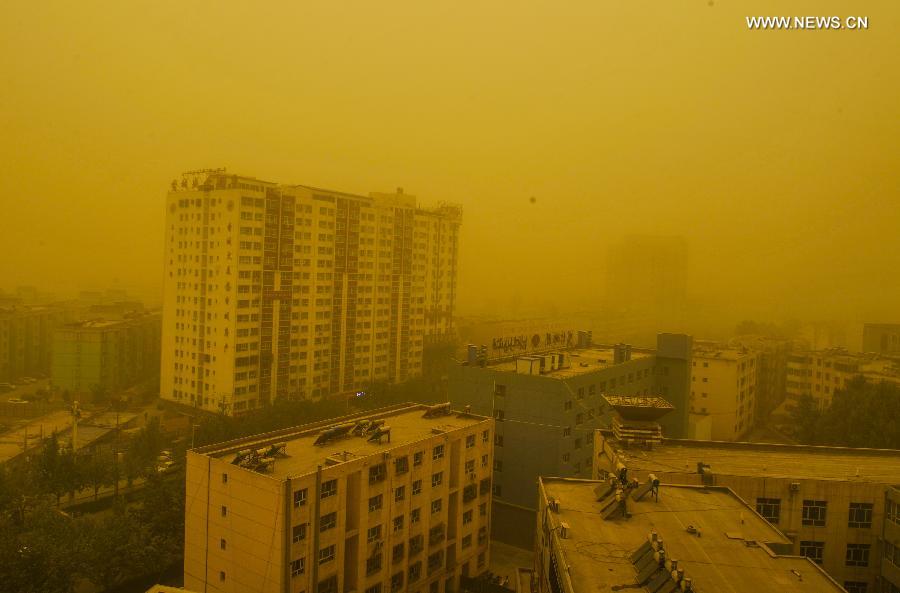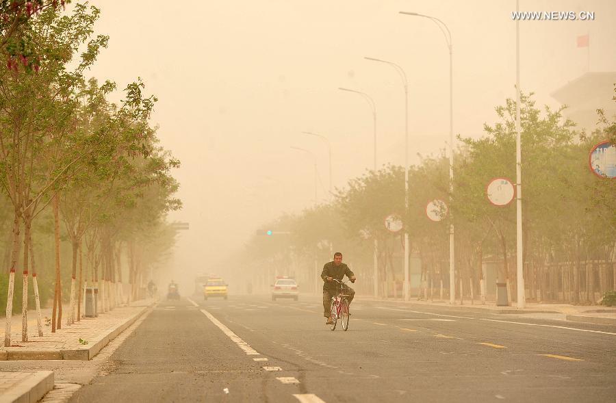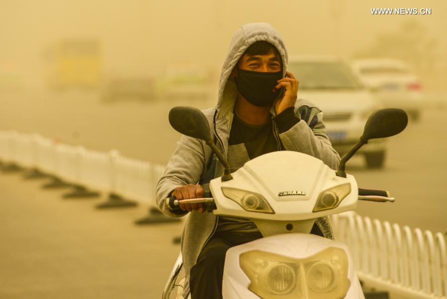 Citizens travel in sandstorm in Zhongwei City, northwest China's Ningxia Hui Autonomous Region, April 24, 2014. Parts of Ningxia was hit by a sandstorm Thursday morning, which will reduce visibility to less than 1,000 meters. (Xinhua/Peng Zhaozhi)