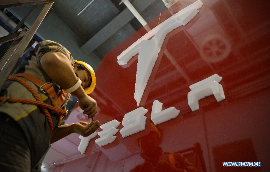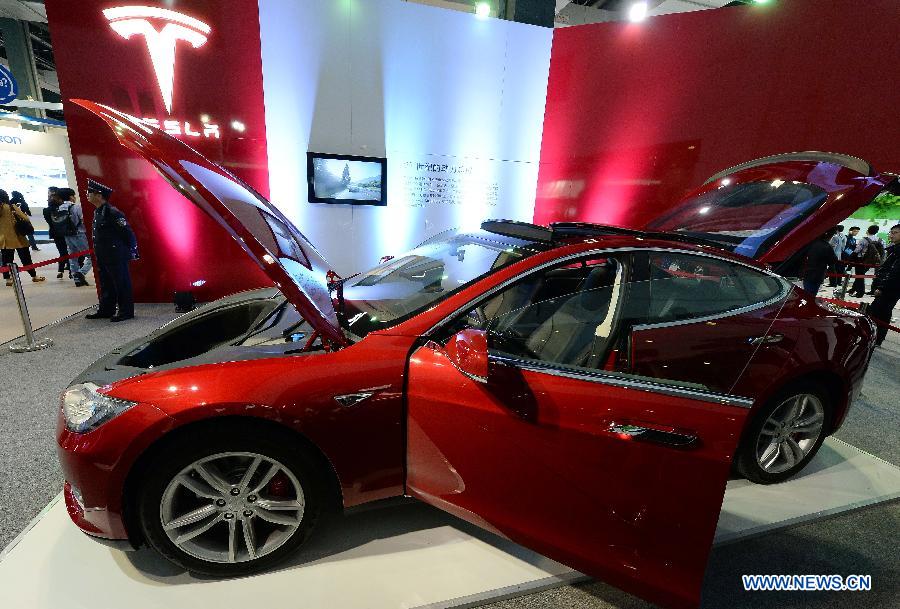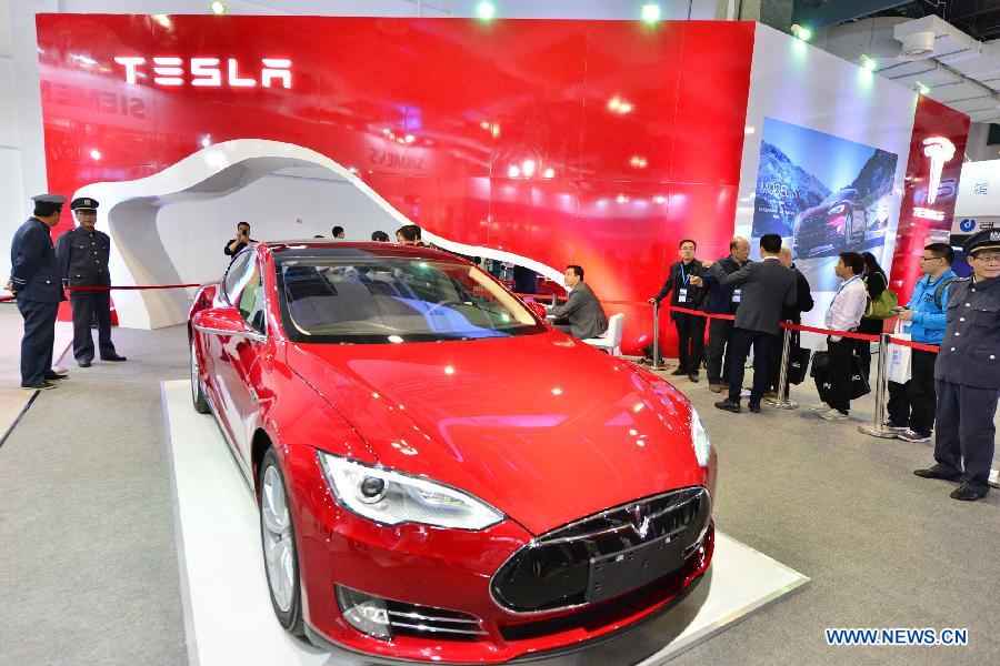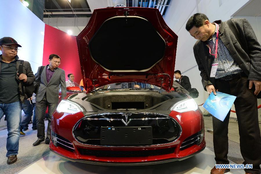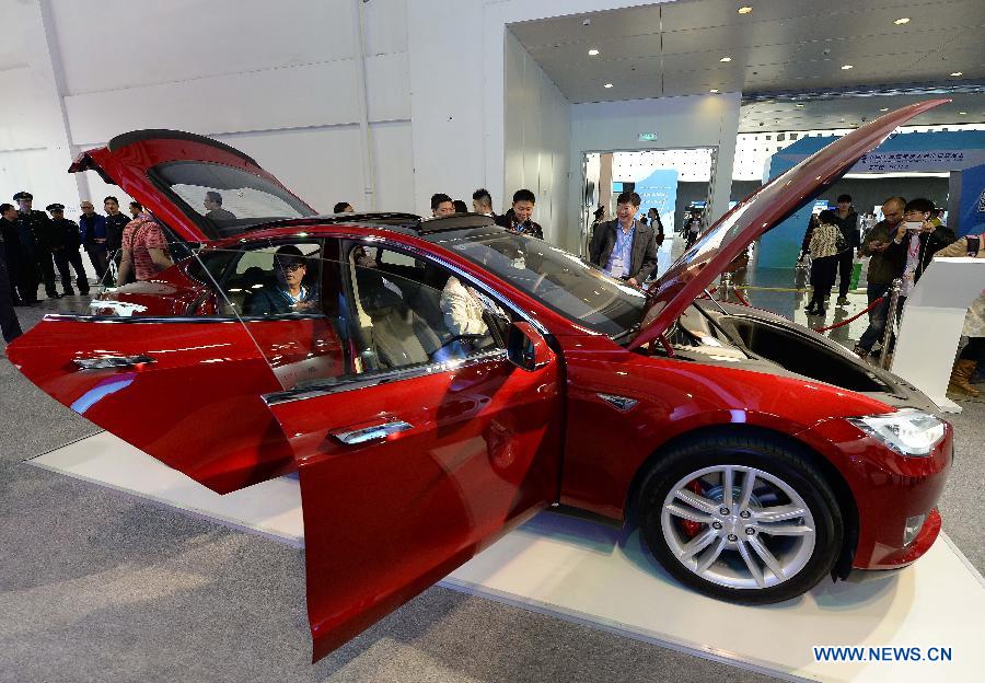 Visitors look at a Tesla vehicle during the 2nd China Shanghai International Technology Fair (CSITF) in east China's Shanghai, April 24, 2014. Tesla Motors is an American company which designs and manufactures electric vehicles. (Xinhua/Lai Xinlin)