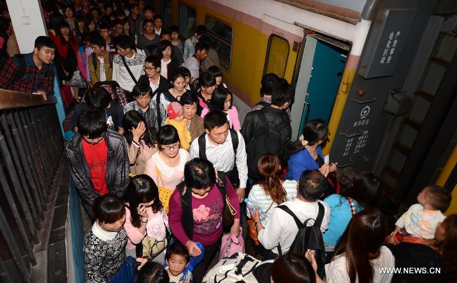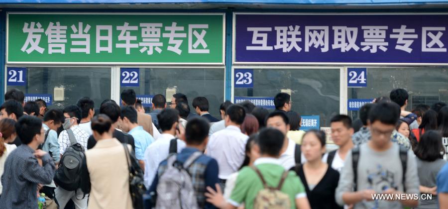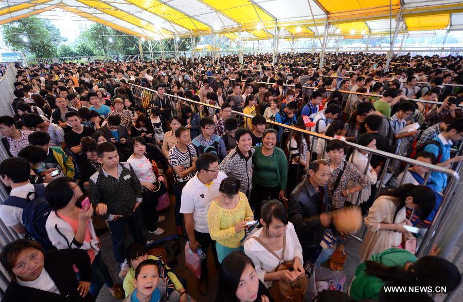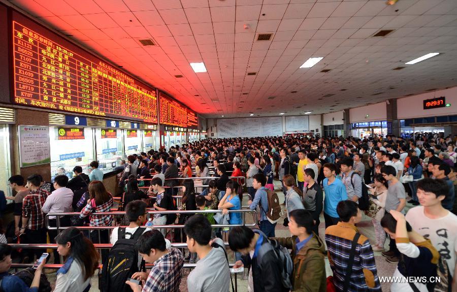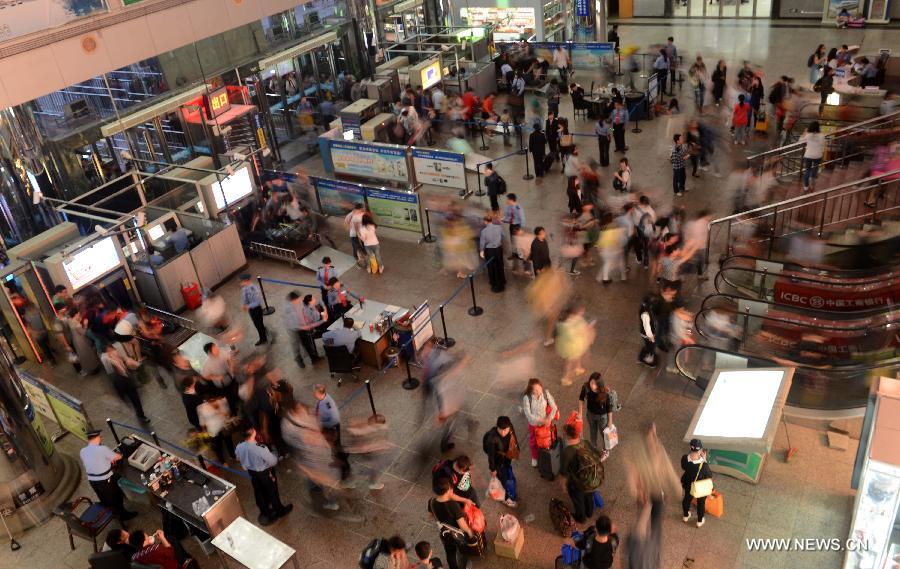 Passengers queue to enter the Nanchang Railway Station in Nanchang, capital of east China's Jiangxi province, April 30, 2014. The four-day period of Labor Day travel peak began on Wednesday. National railways are expected to receive 36,400,000 passengers from April 30 to May 3, 2014. (Xinhua/Zhou Ke)