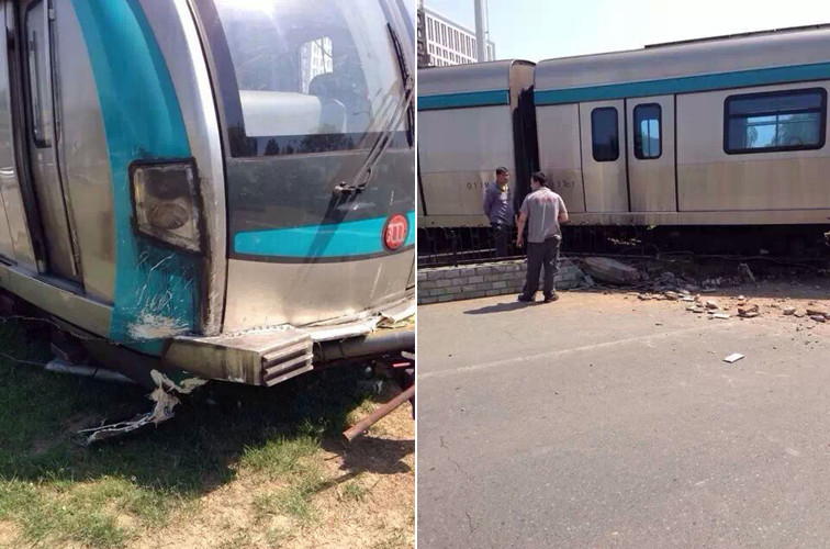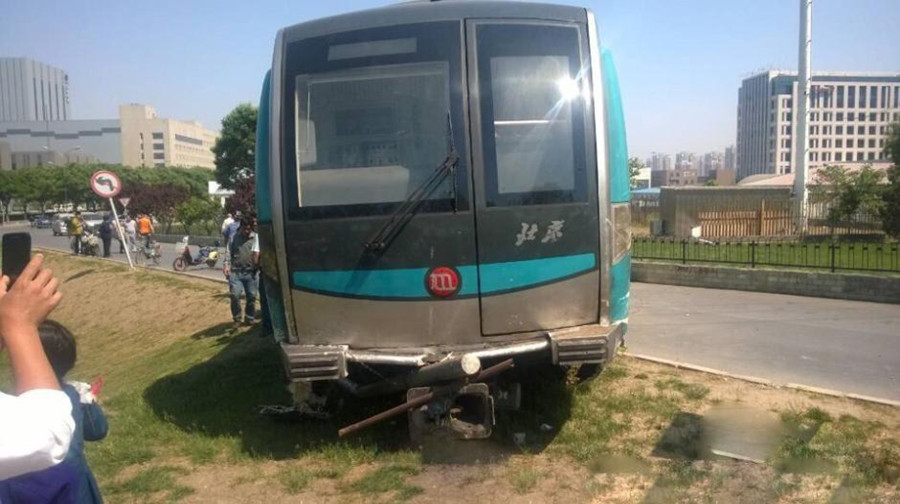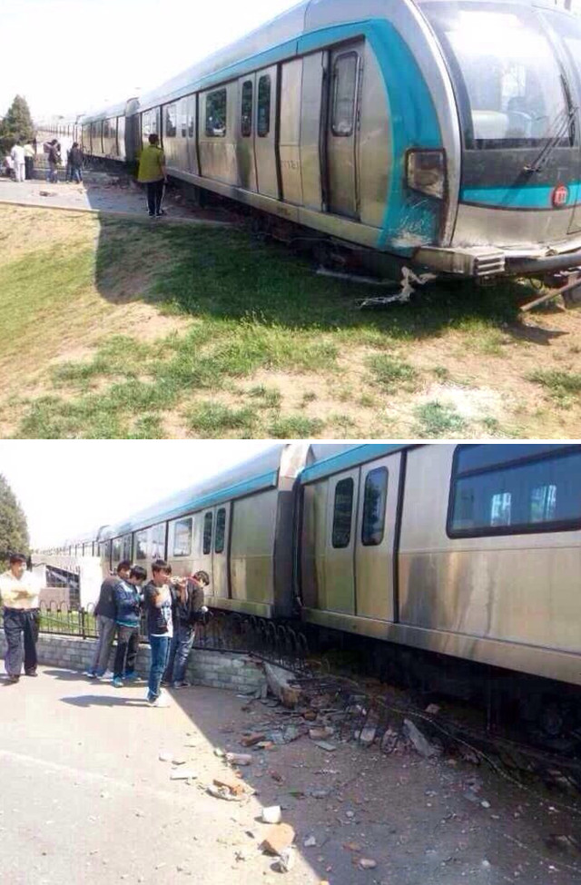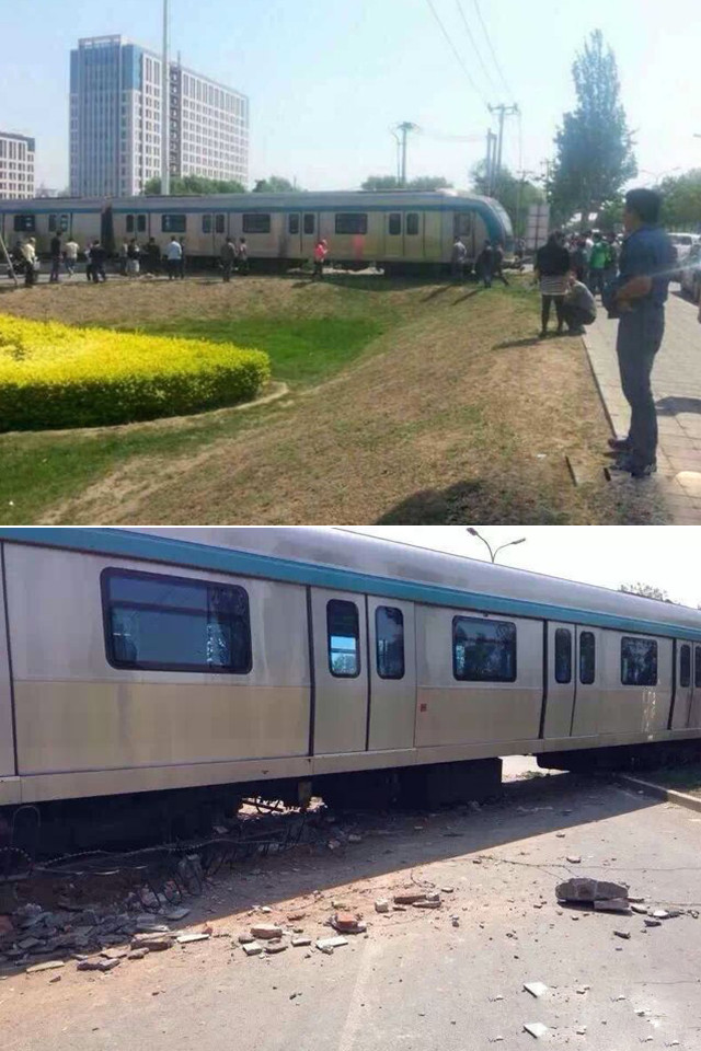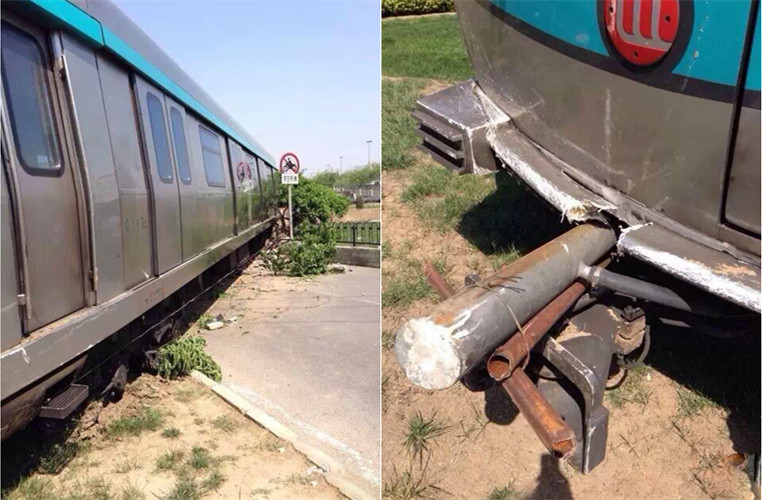 A Line 4 subway train derails during a trial run near the south 4th Ring Road in Beijing at around 10:20 a.m. on May 3, 2014. The train failed to halt in time whilst running on the line's new overground section. No casualties have been reported. [Photo/Beijing Times]