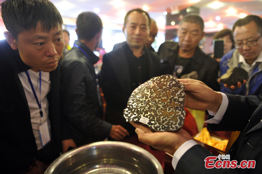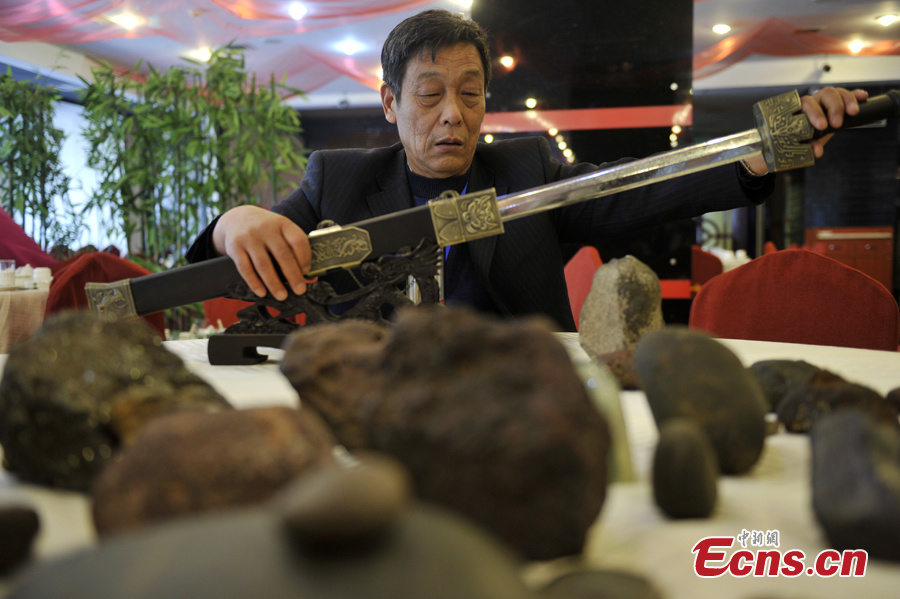 A visitor tries to carry a meteorite fragment in Taiyuan, Shanxi province on Monday, May 5, 2014. More than 30 meteorite enthusiasts converged in the city to exhibit their meteorite collection that day. (Photo: China News Service/Wei Liang)
