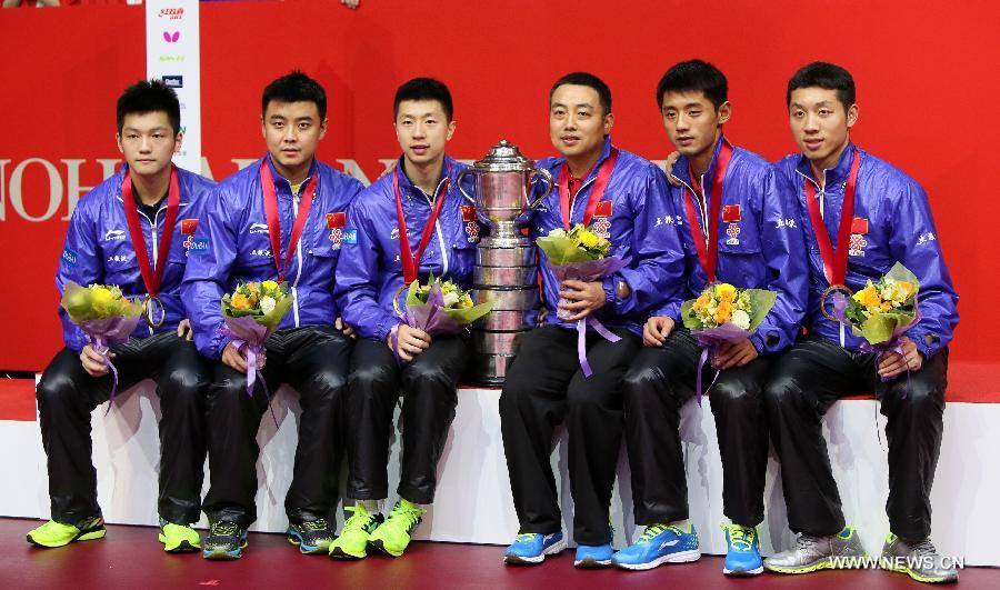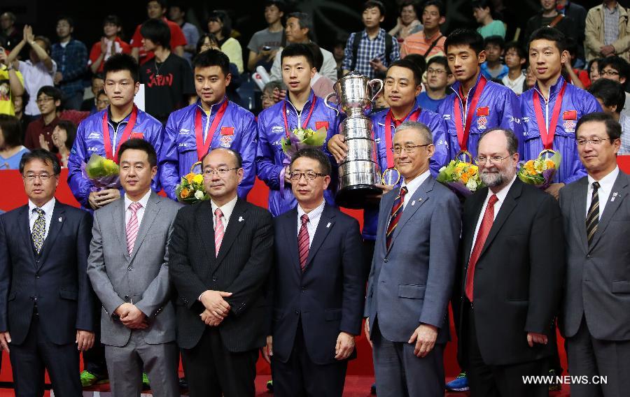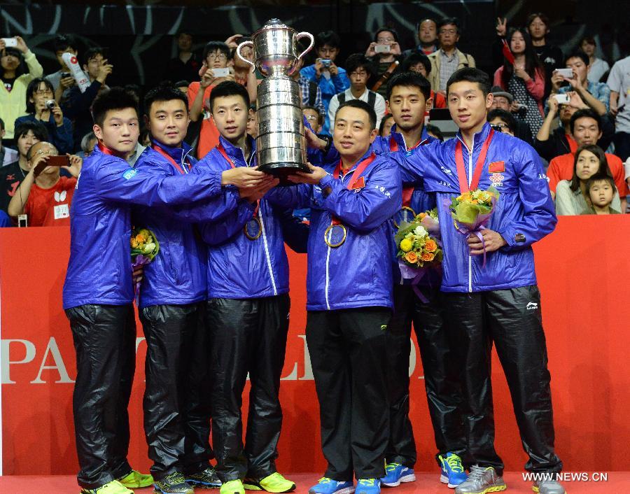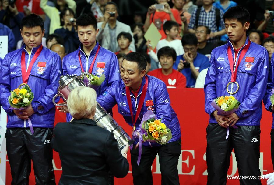 China's Ma Long (1st L) holds the trophy and celebrates with coach Liu Guoliang (2nd L) and teammates Zhang Jike (3rd L) and Xu Xin during the awarding ceremony for the men's group event in Zen Noh 2014 World Table Tennis Championships in Tokyo, Japan, May 5, 2014. China beat Germany 3-1 in the final and claimed the title of the event. (Xinhua/Ma Ping)