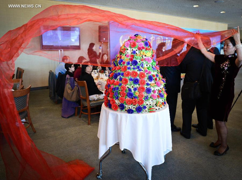 A chef from China's Shanxi province demonstrates noodle-making skills during the China Shanxi Food Festival at the United Nations headquarters in New York, May 5, 2014. The China Shanxi Food Festival kicked off here in New York on Monday at the headquarters of the United Nations. Known as "the Home of Chinese Flour Foods," Shanxi is famous for its Jin Cuisine, which is characterized by a wide selection of ingredients, strong flavor and color, and the preference for vinegar, spice and a strong taste. (Xinhua/Niu Xiaolei)