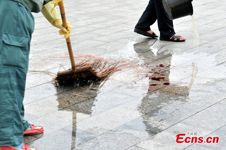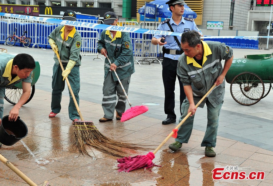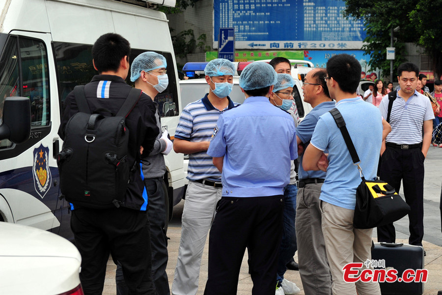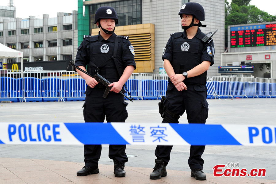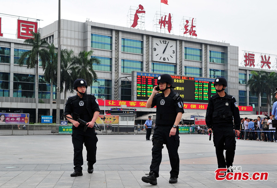 Six people were injured in a knife attack at a railway station in Guangzhou of south China's Guangdong province on Tuesday morning, local authorities said. The attack happened at about 11:30 a.m. in the square of Guangzhou Railway Station, according to police. Four of the injured, three women and a man, are receiving treatment at the General Hospital of Guangzhou Military Command of the People's Liberation Army. Their injuries are not life-threatening. A male suspect with a knife was shot and caught by police. Photo taken on May 6, 2014 shows armed police officers are seen at the square of Guangzhou Railway Station.[Photo/Chen Jimin]