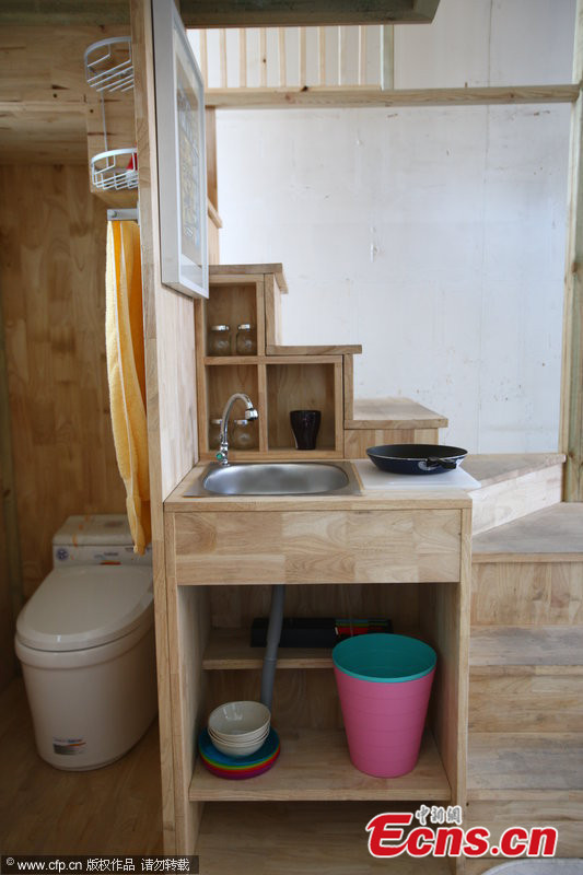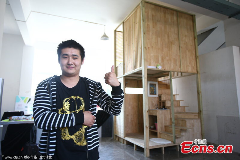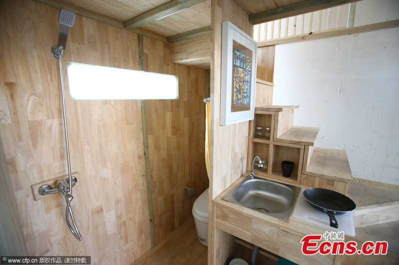 Wang Le, a recent graduate with a degree in environmental art design from Ningbo University in Zhejiang province has designed a small 3.8 square meter log cabin that stands at a slender 4.2 meters. It cost less than 10,000 yuan ($1,605.11), and has a kitchen, bathroom and bedroom. [Photo/CFP]