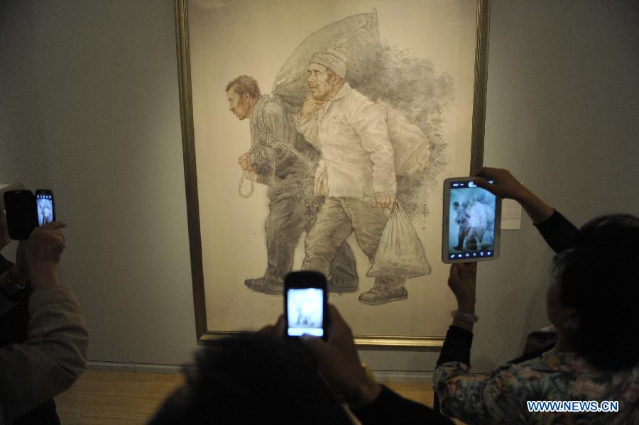 Visitors take photos of a painting work during the Exhibition of Contemporary Chinese Ink Painting and Sculpture at the National Art Museum of China in Beijing, capital of China, May 7, 2014. (Xinhua/Lu Peng)